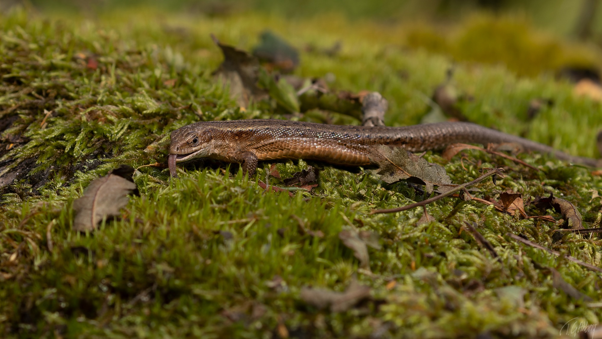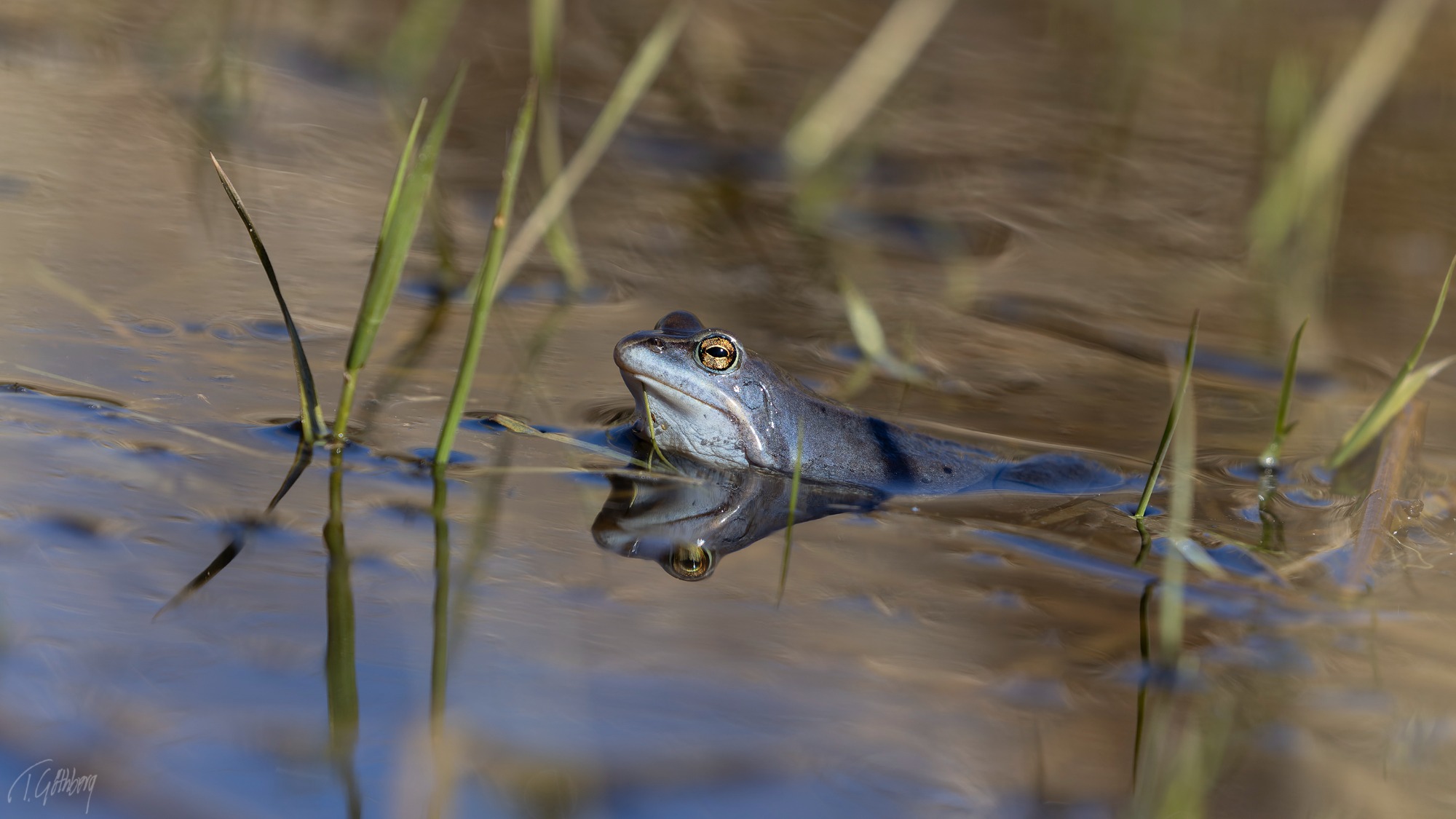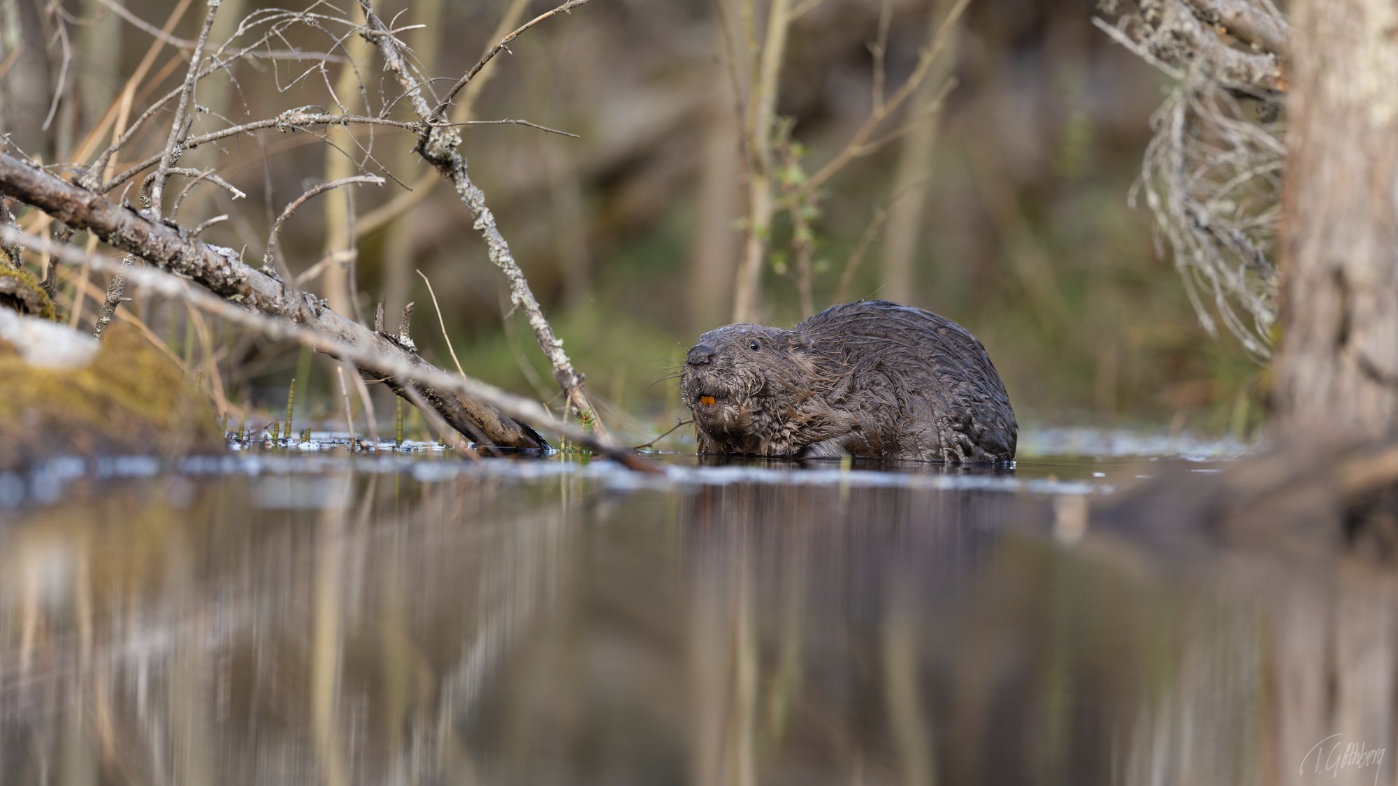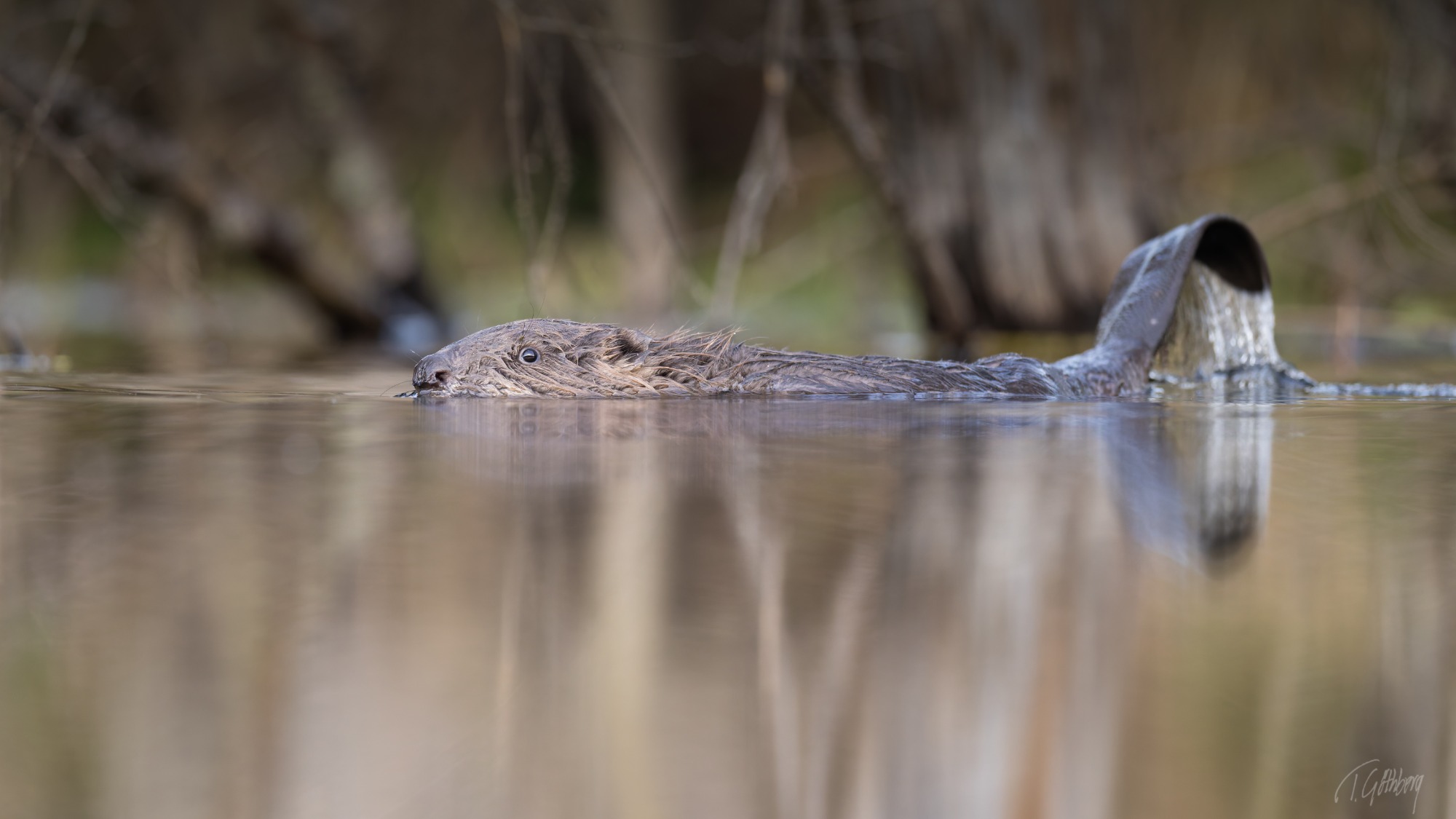 Bävern glider nyfiket fram över vattnet, men bestämmer sig för att dyka. Precis innan, smäller den svansen mot ytan.