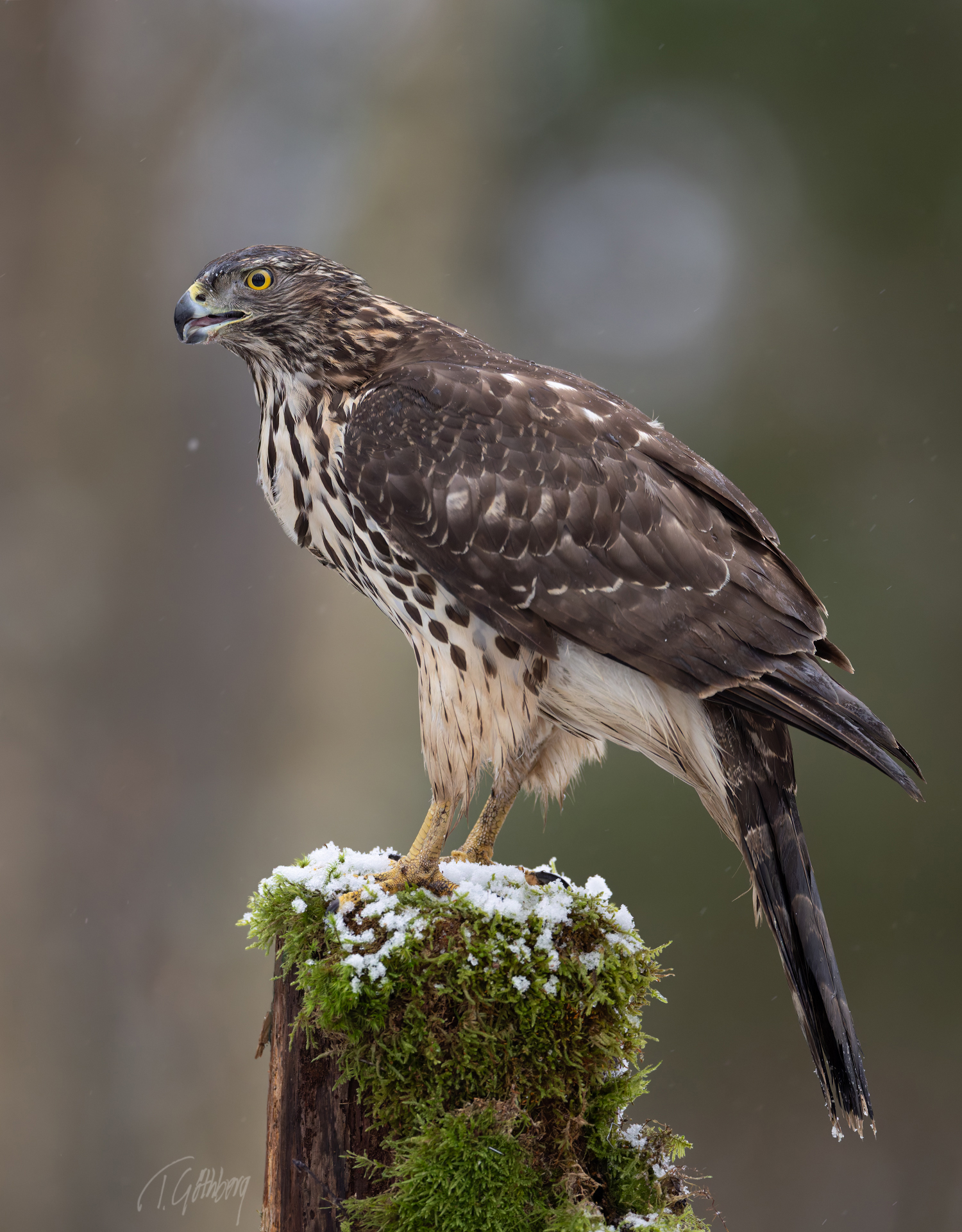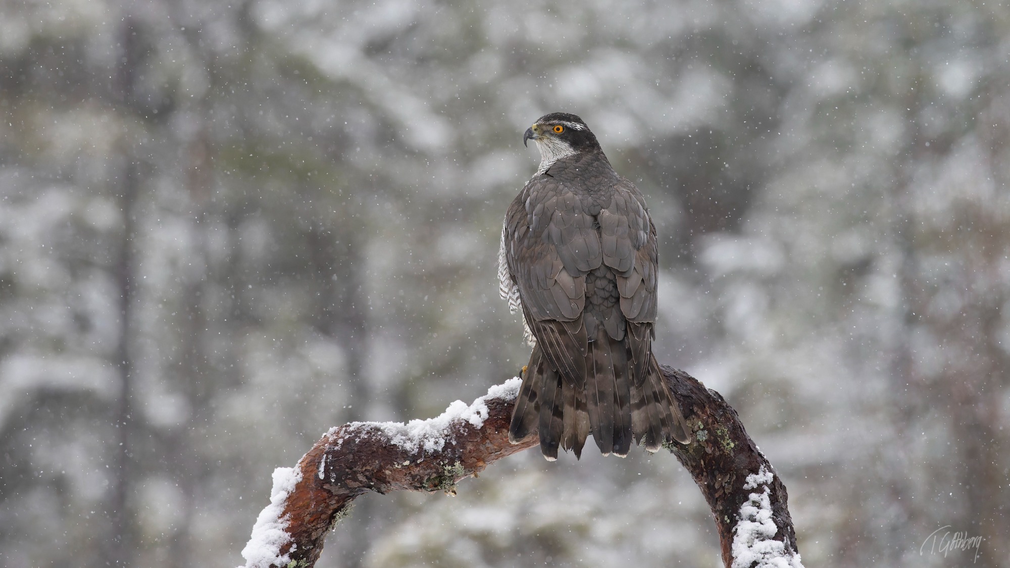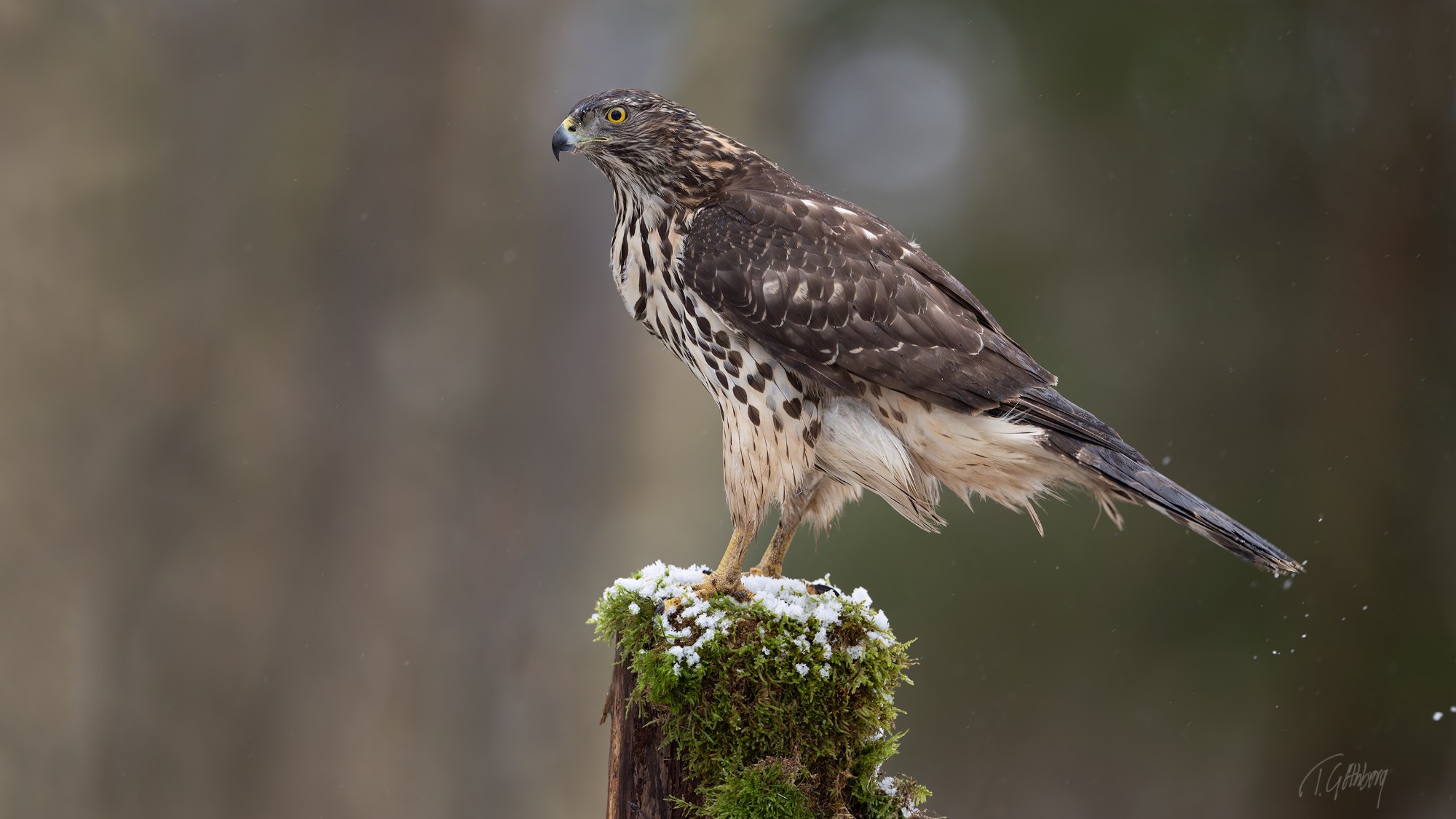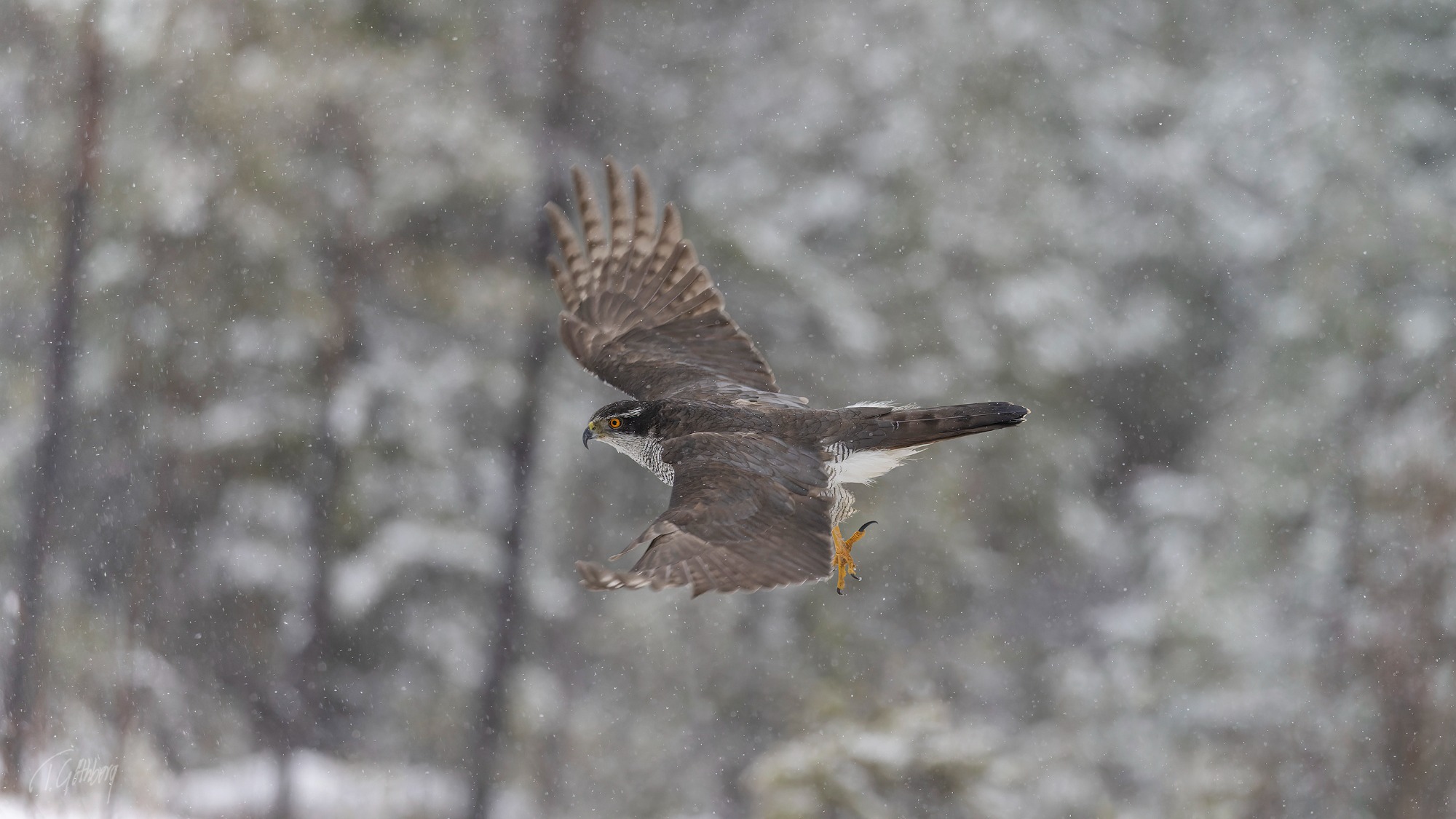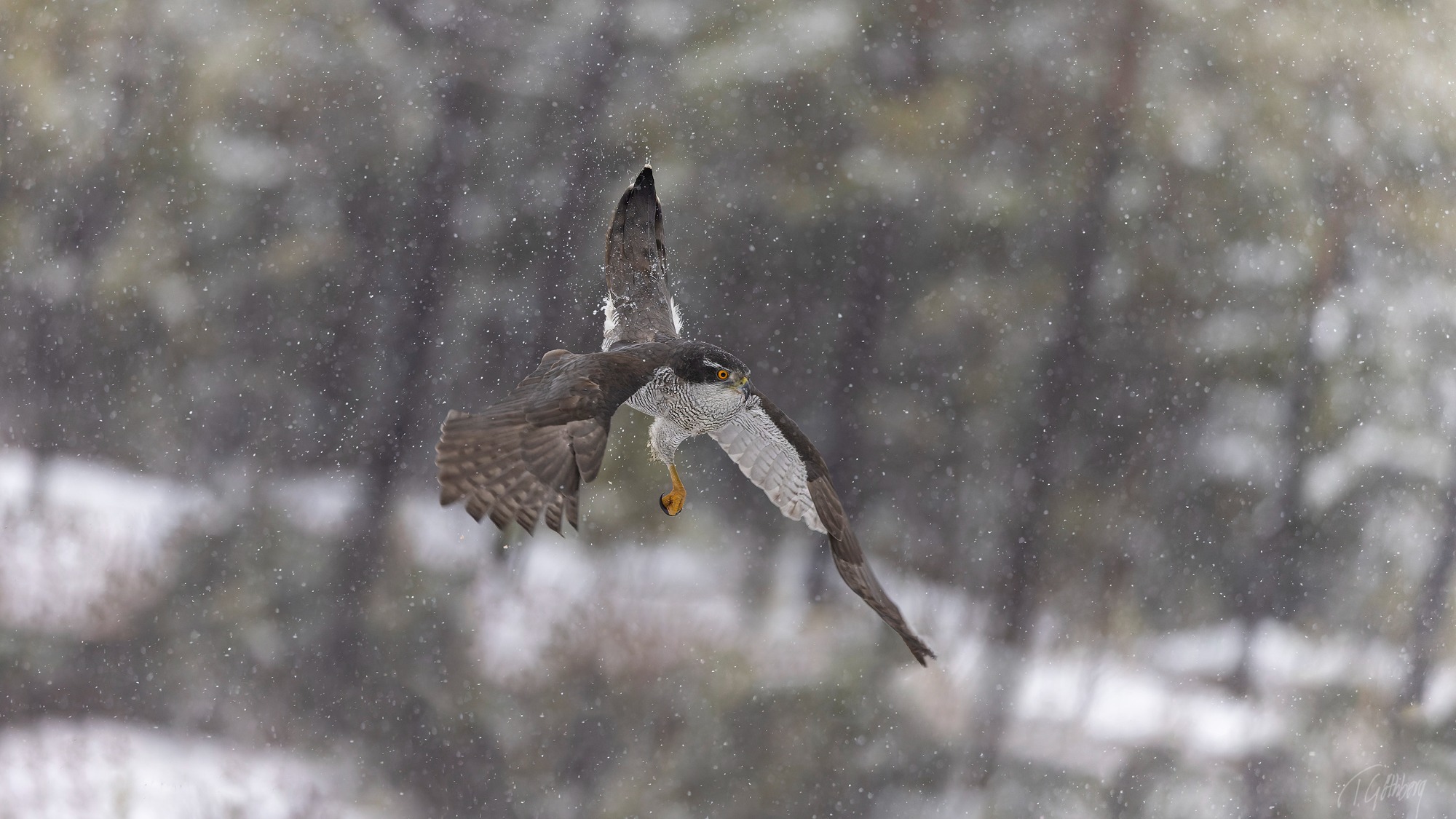 I det snöblandade regnet uppvisar höken sin skicklighet i luften – en sann mästare i snabb manövrering!