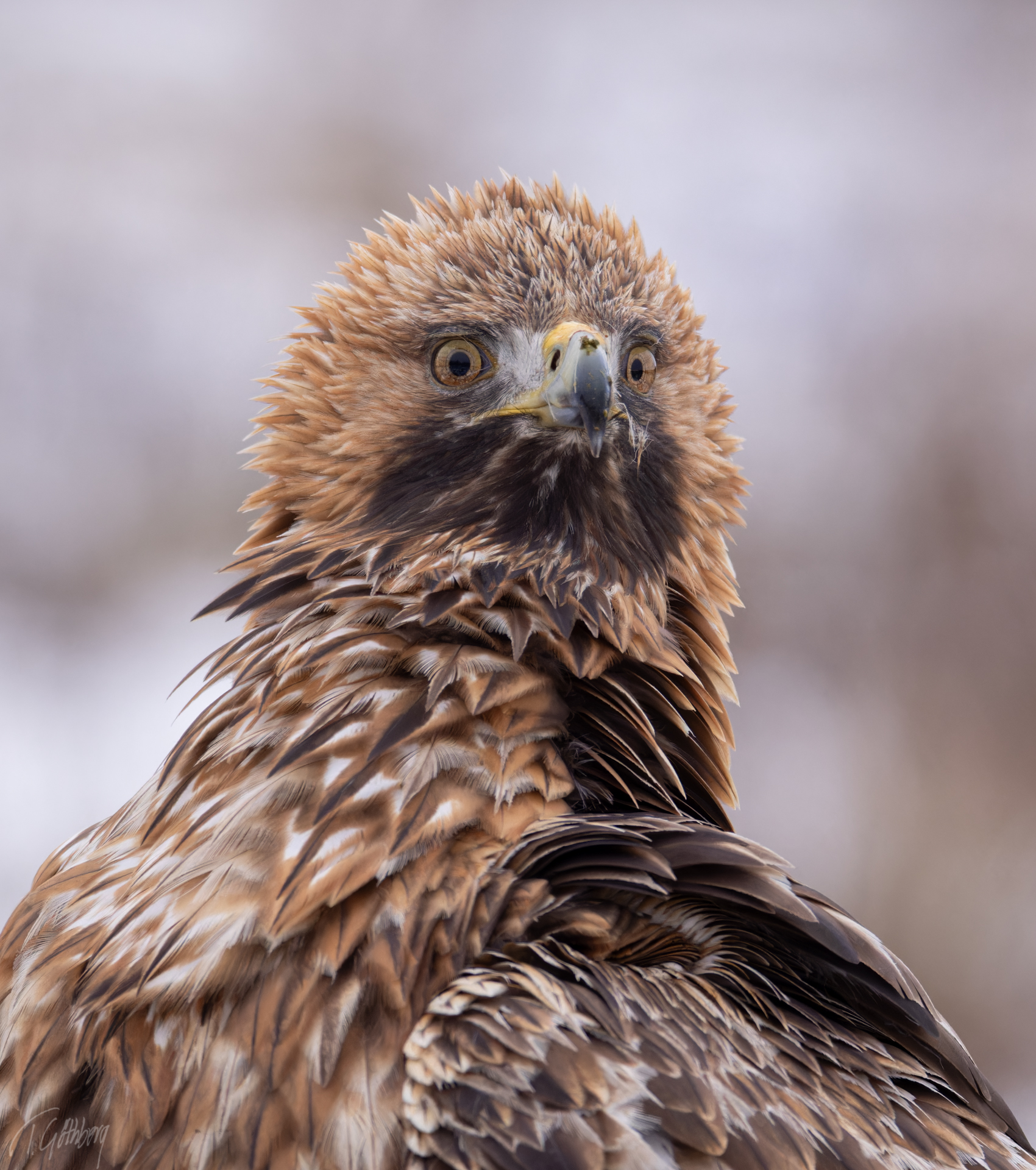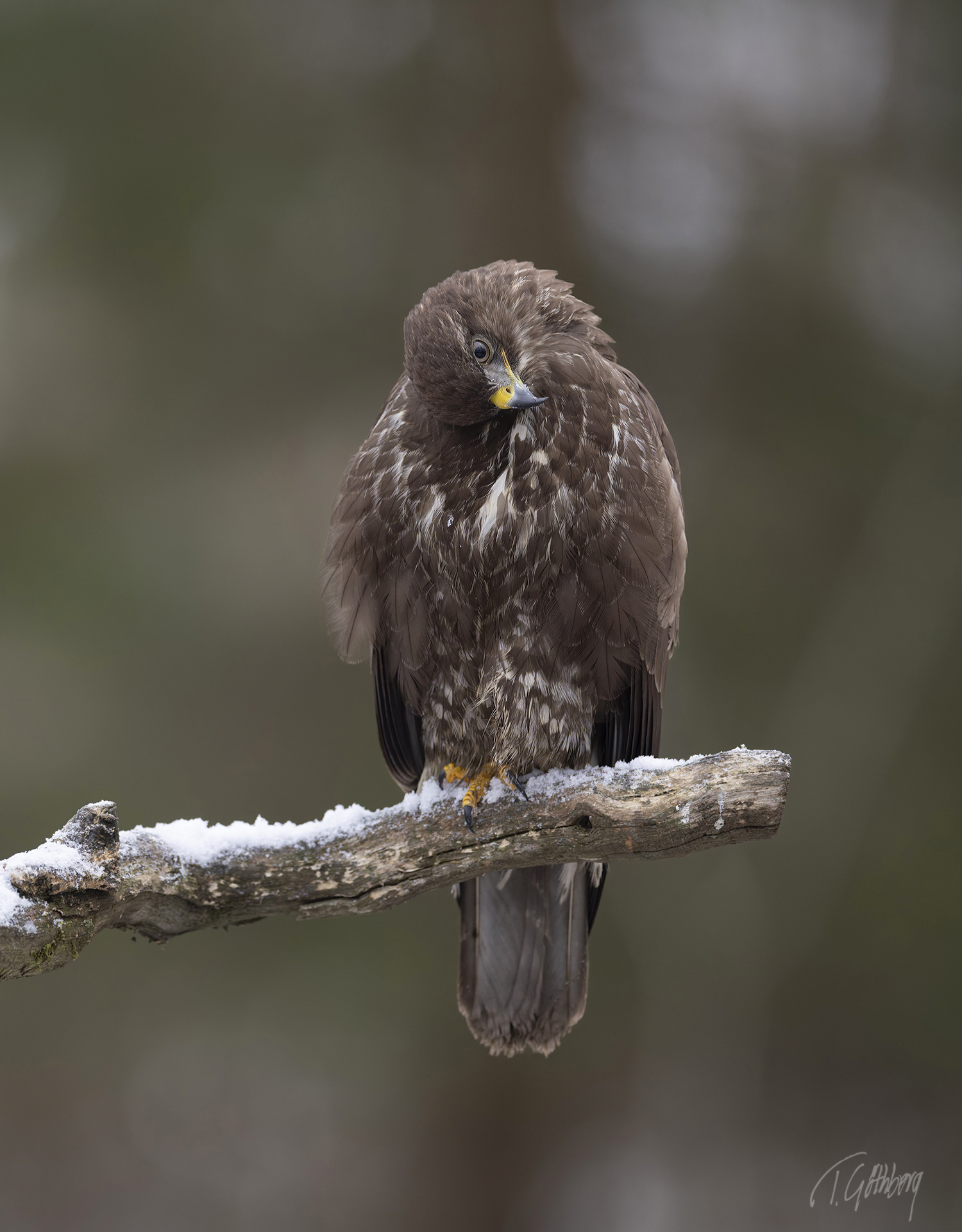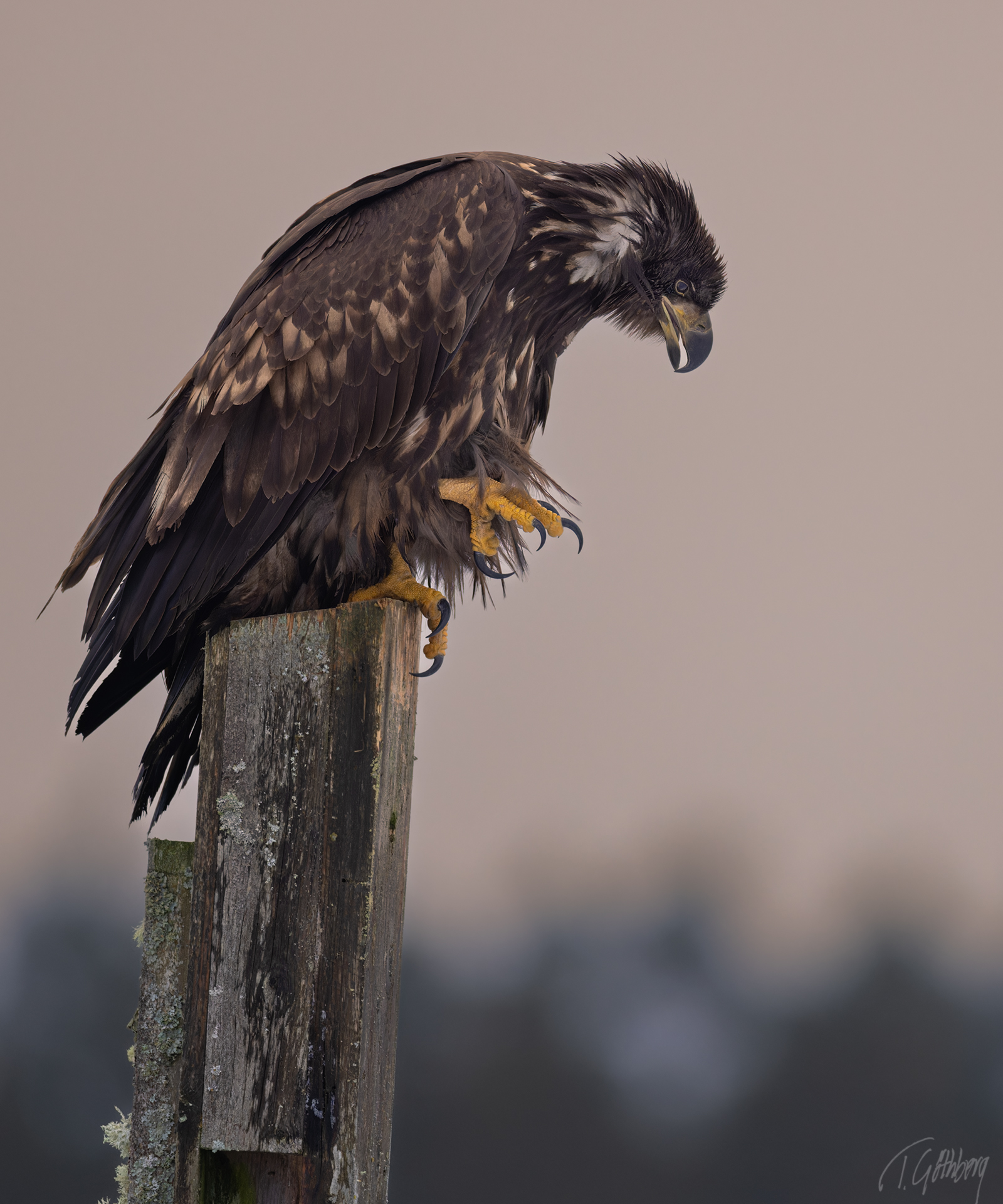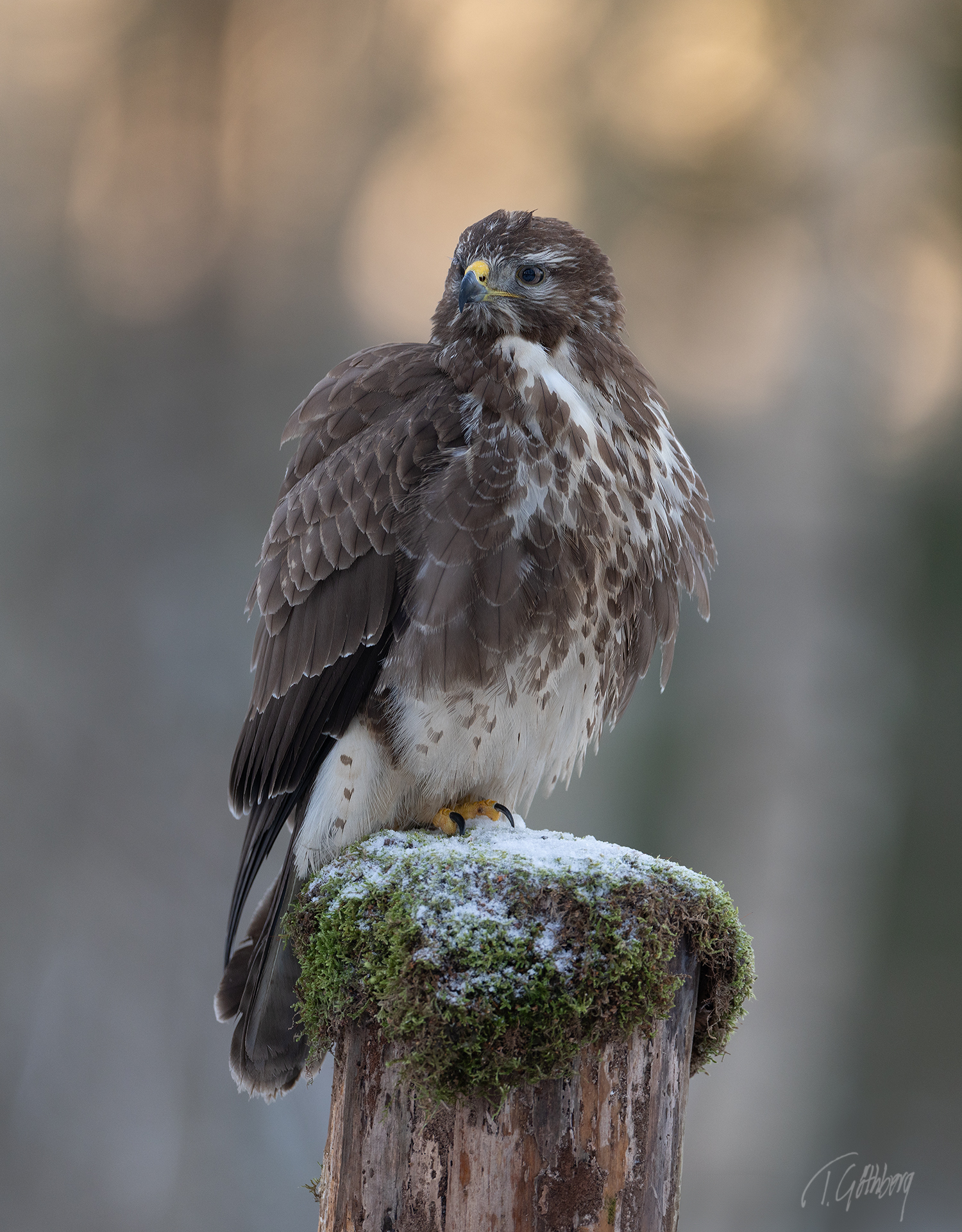 På stubben har vråken fluffat upp sina fjädrar, medan morgonens ljus glittrar som små diamanter i bakgrunden.