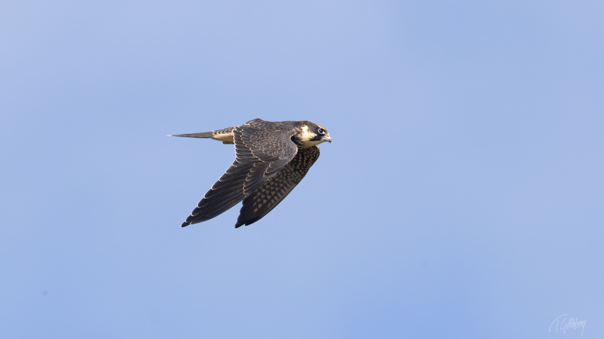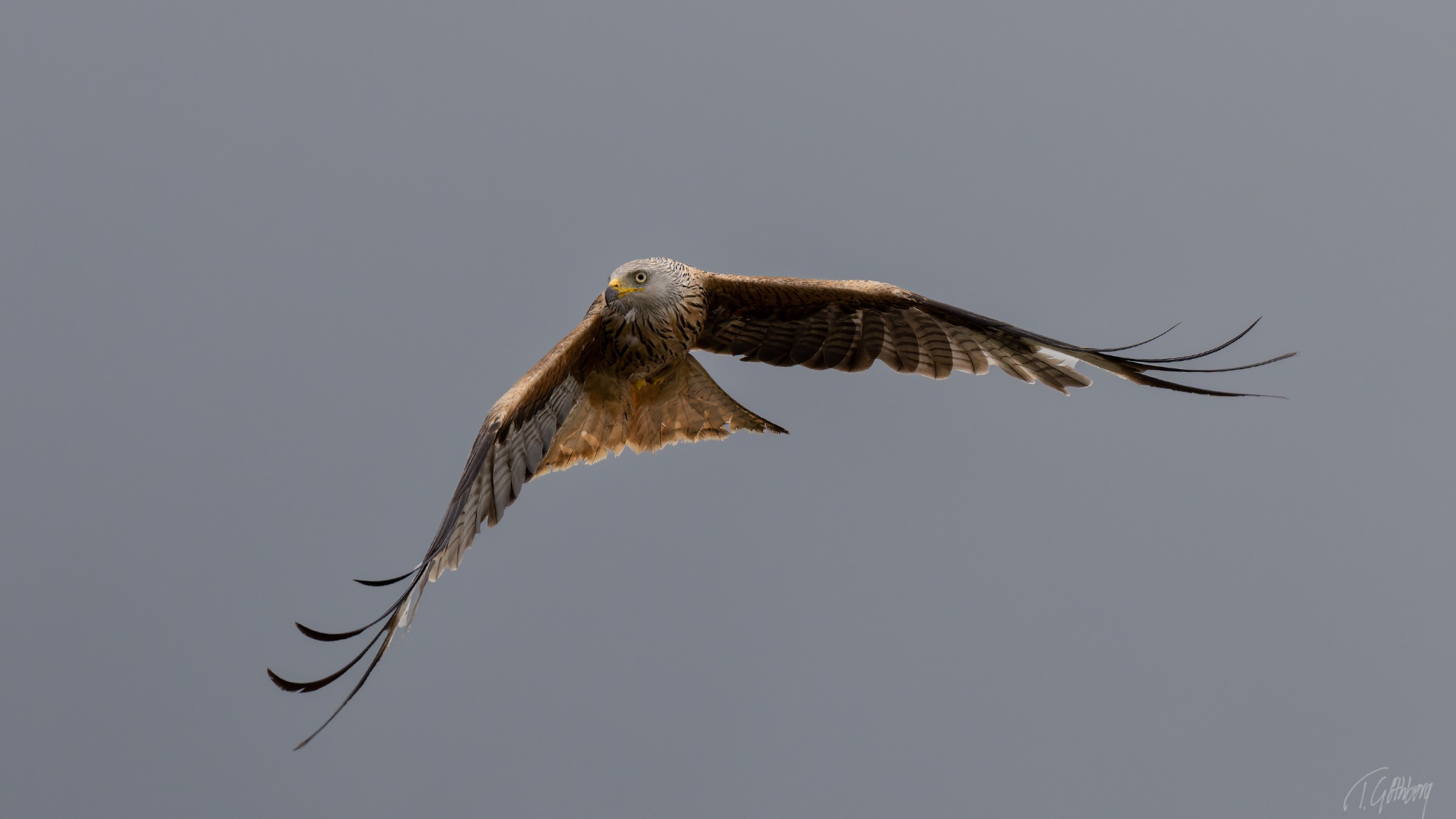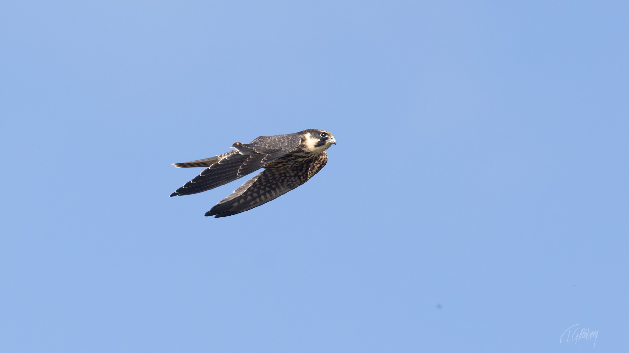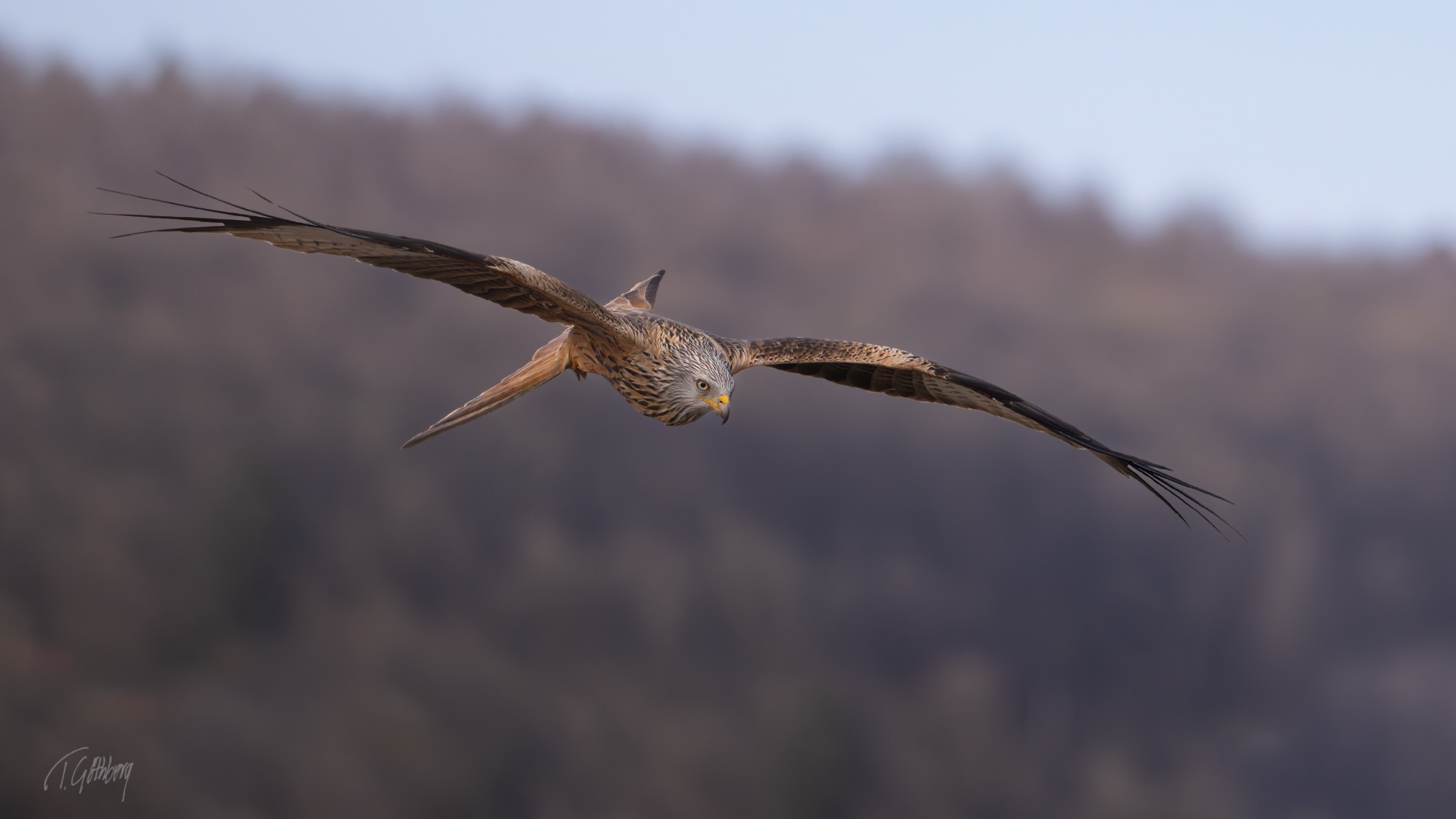 Elegant i luften, med långa vingar och stjärtfjädrar som effektivt roder – Mösseberg reser sig stilla i bakgrunden.