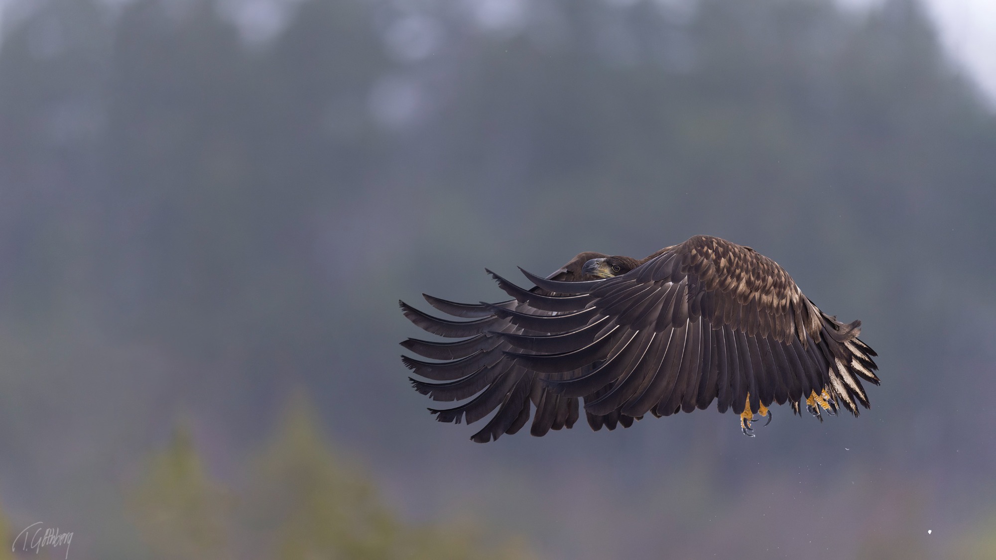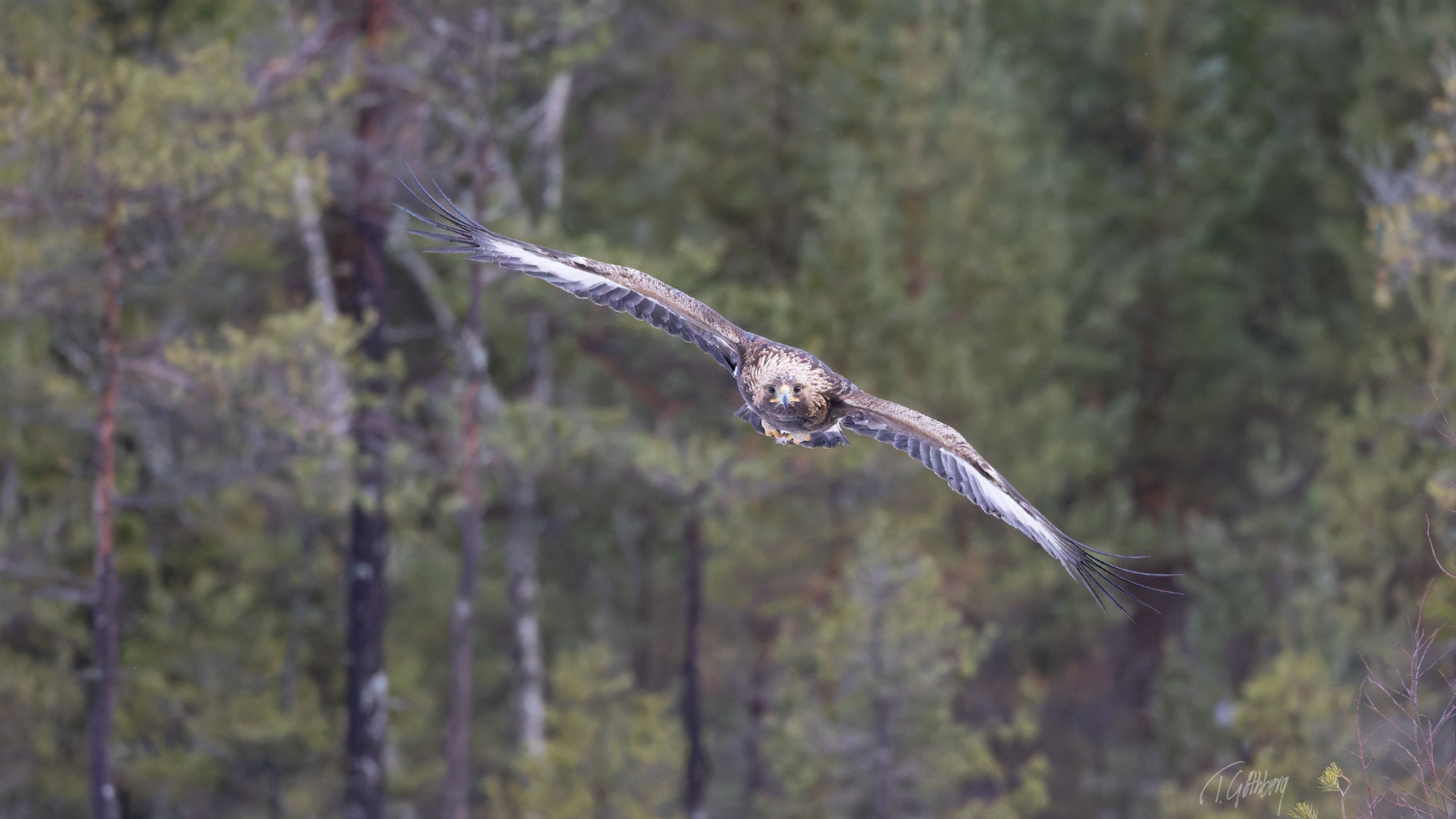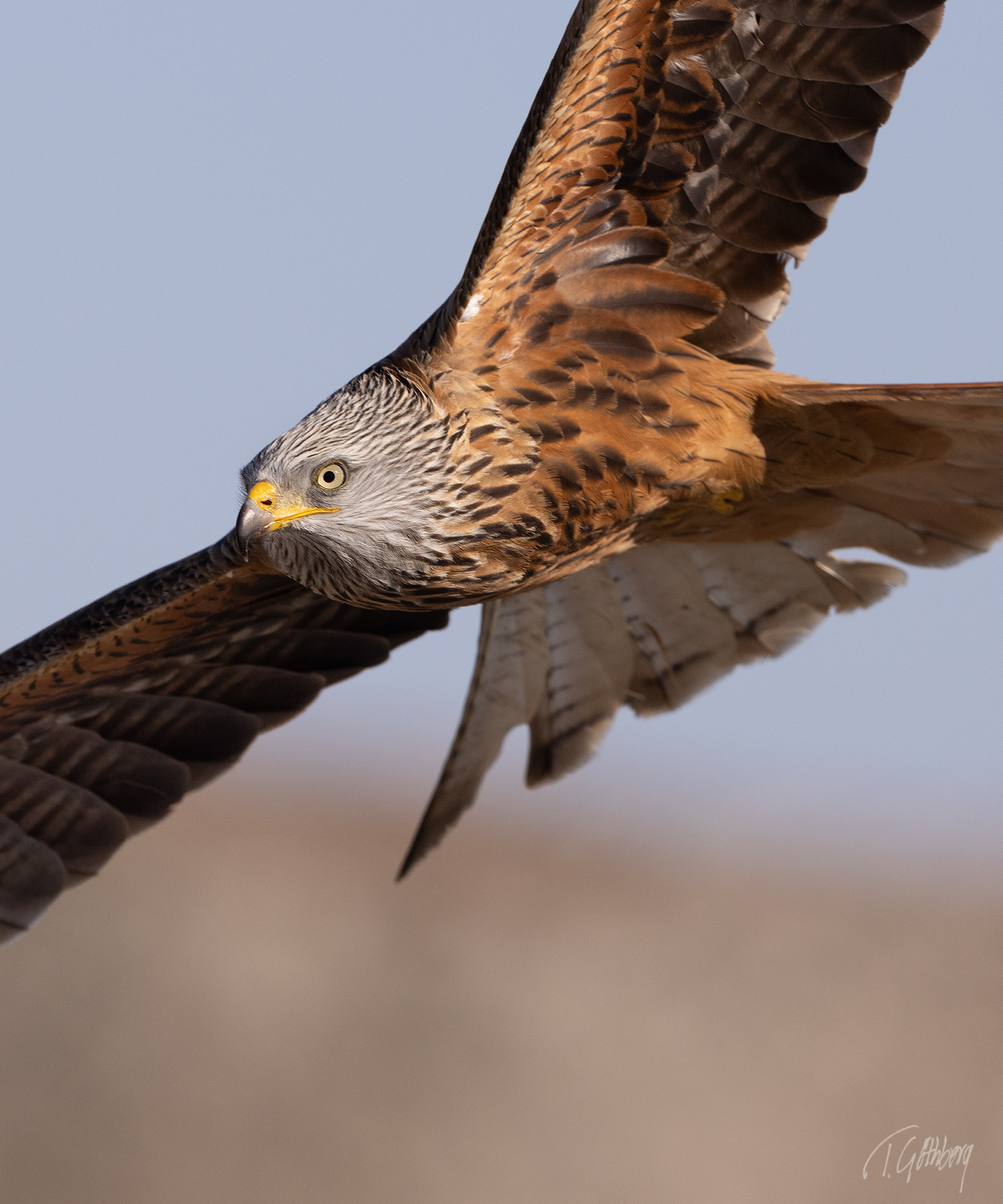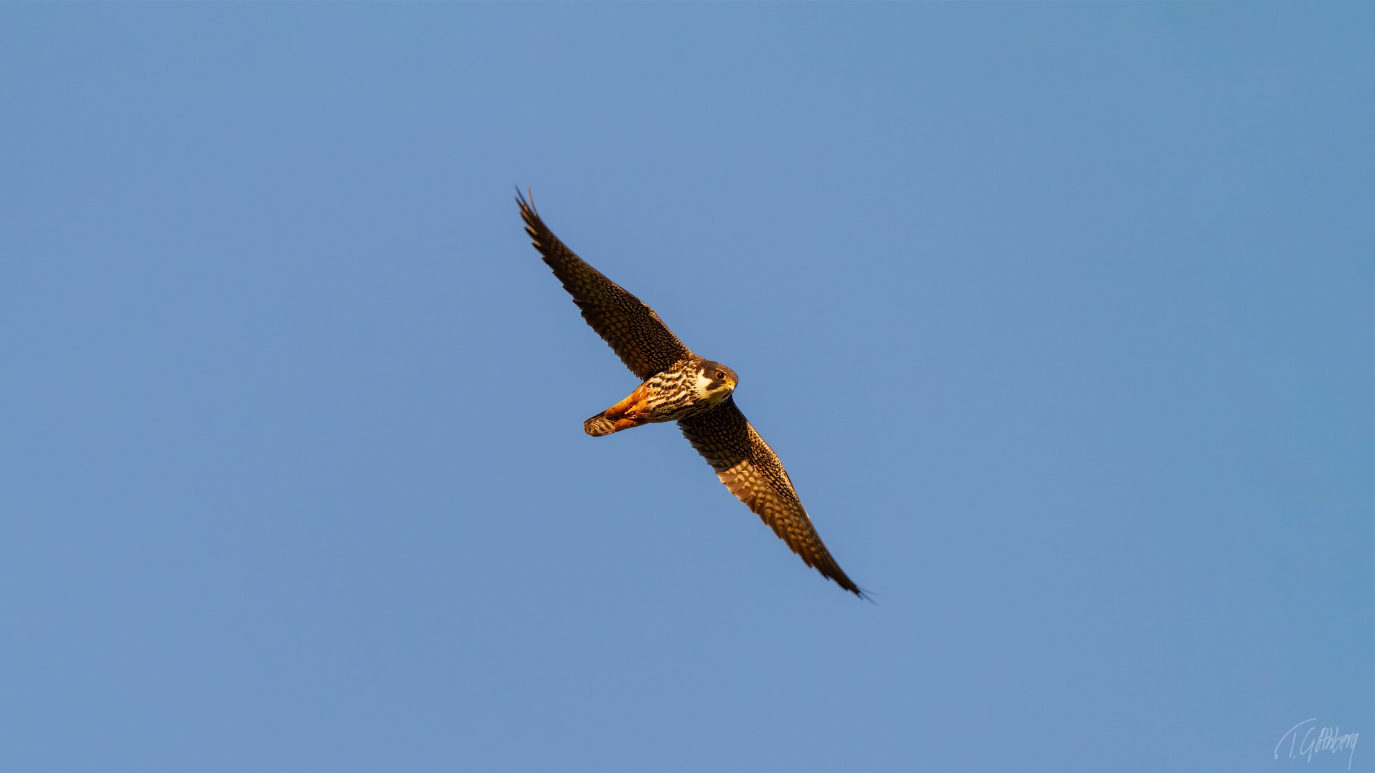 Elegant i luften, med långa vingar och stjärtfjädrar som effektivt roder – Mösseberg reser sig stilla i bakgrunden.