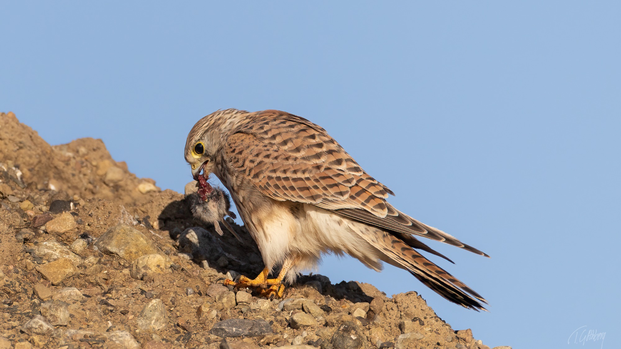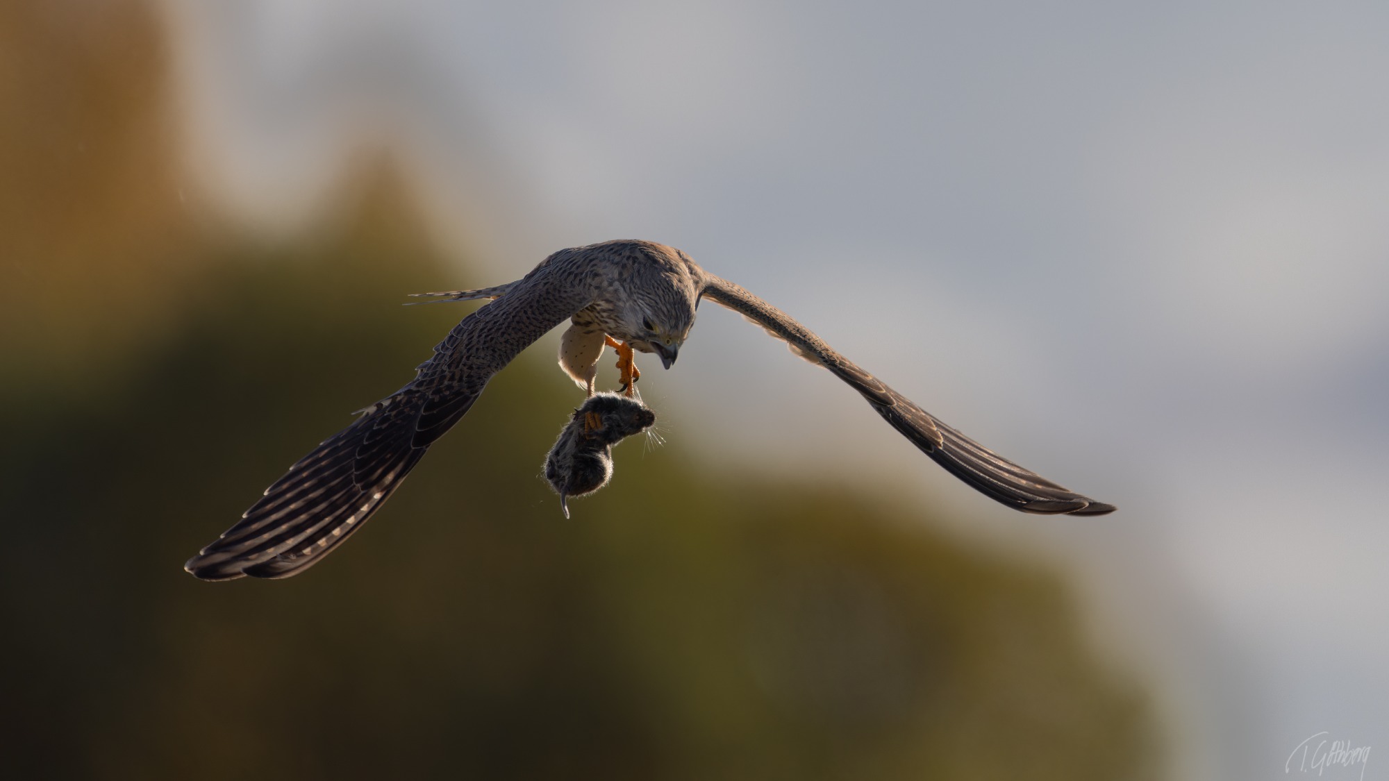 Tornfalken har just lyft från gräset där den fångat sitt byte. Nu gäller det att snabbt hitta en plats att äta ifred.