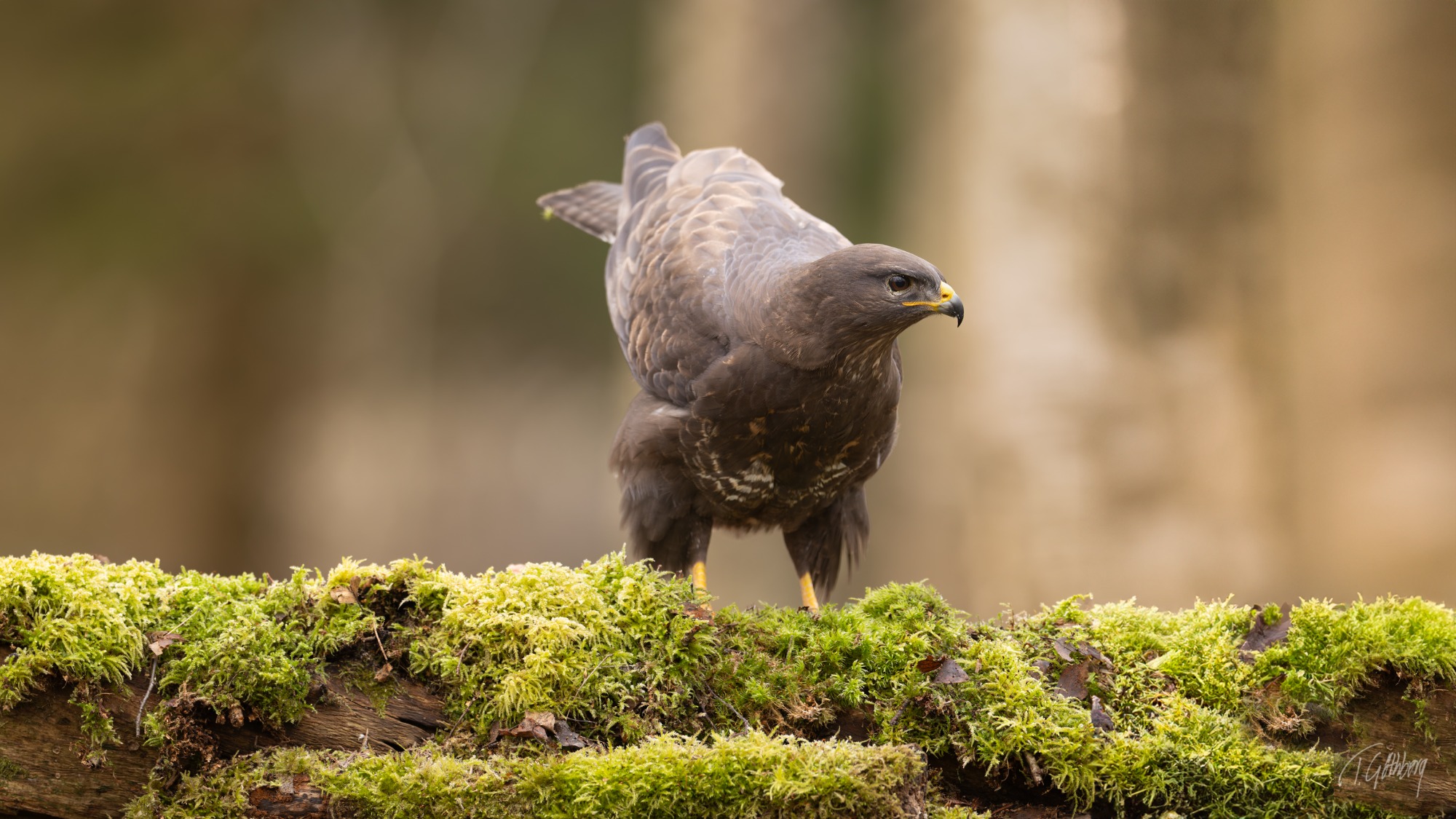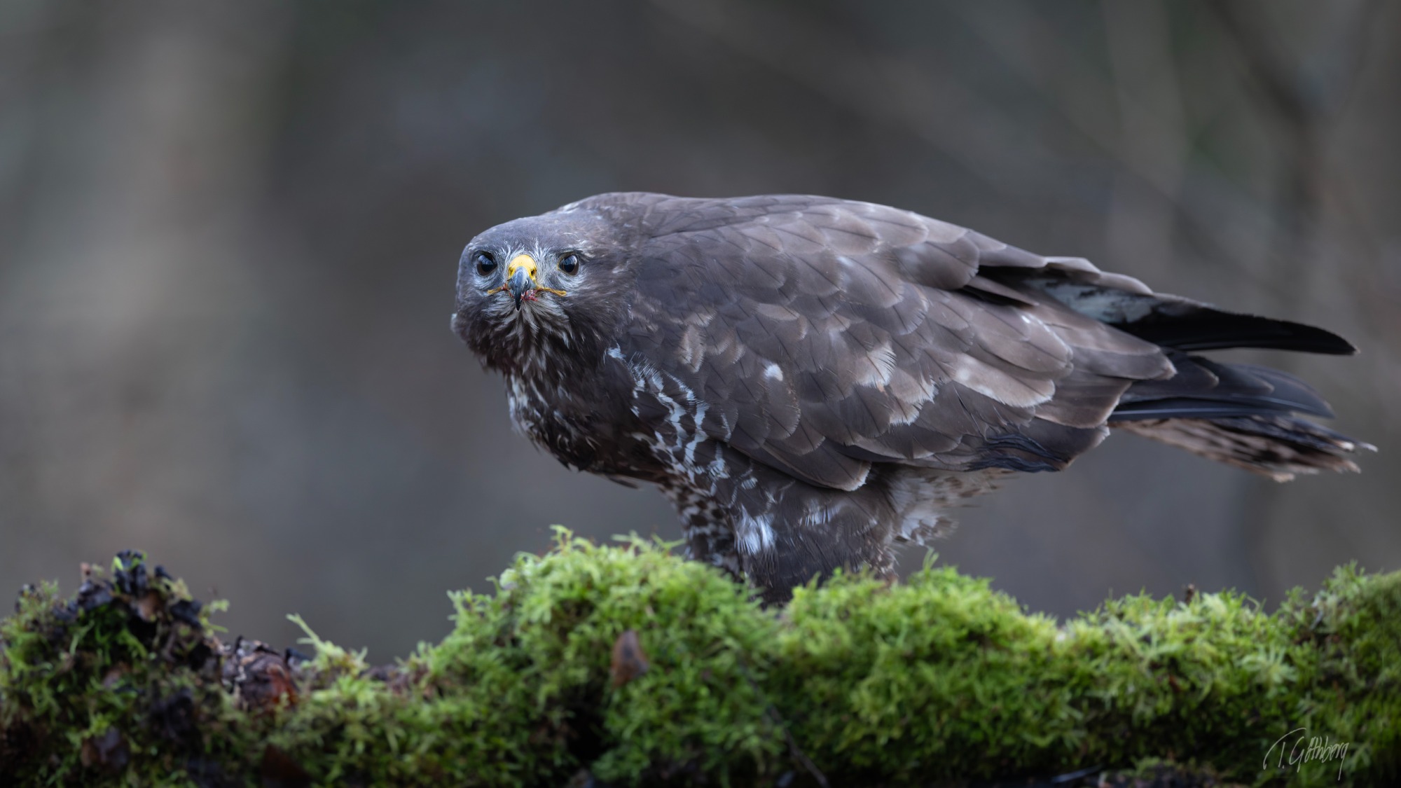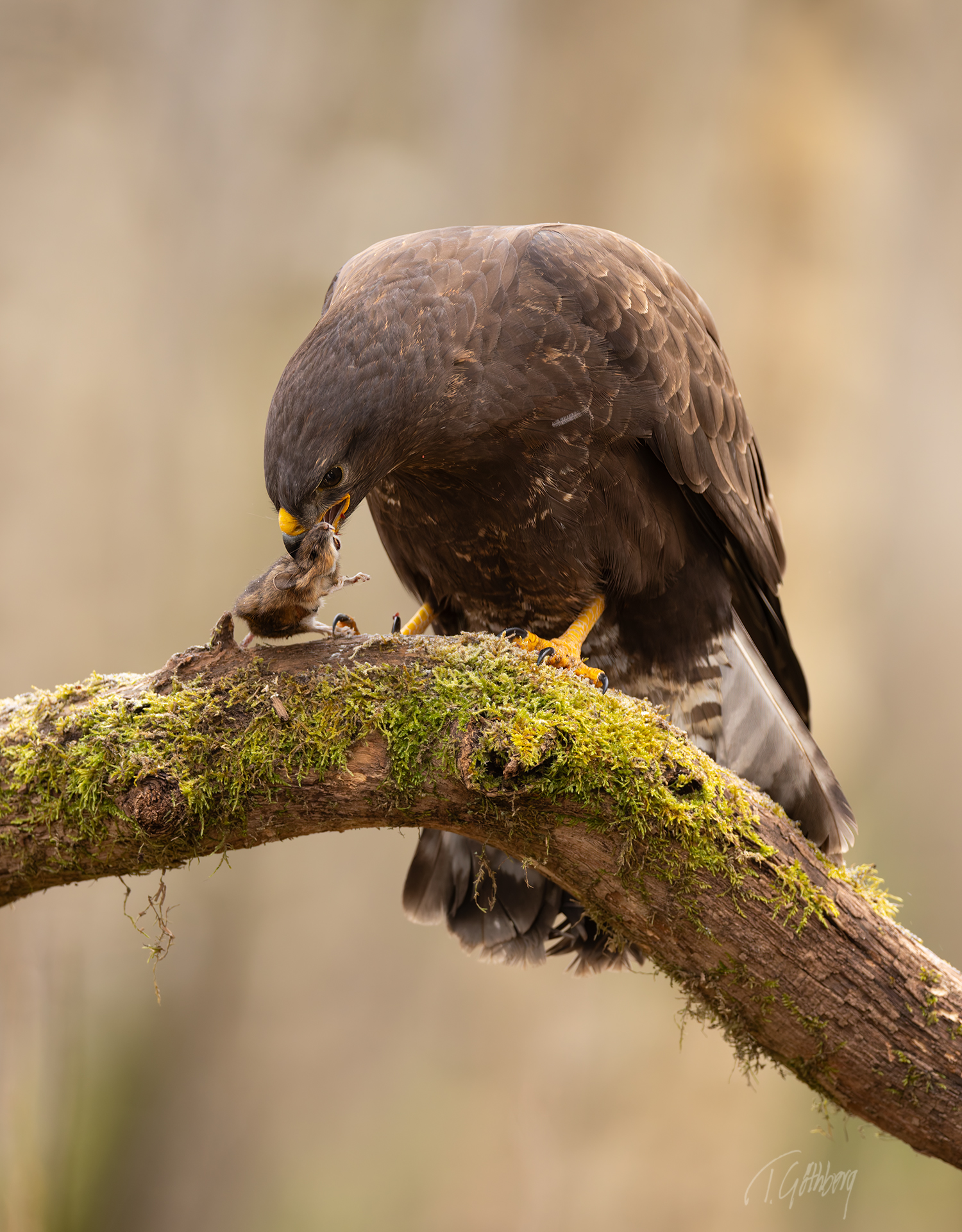 På en mossbeklädd gren sitter vråken, stolt med sin lilla mus i klorna – ett tyst ögonblick av naturens kretslopp.