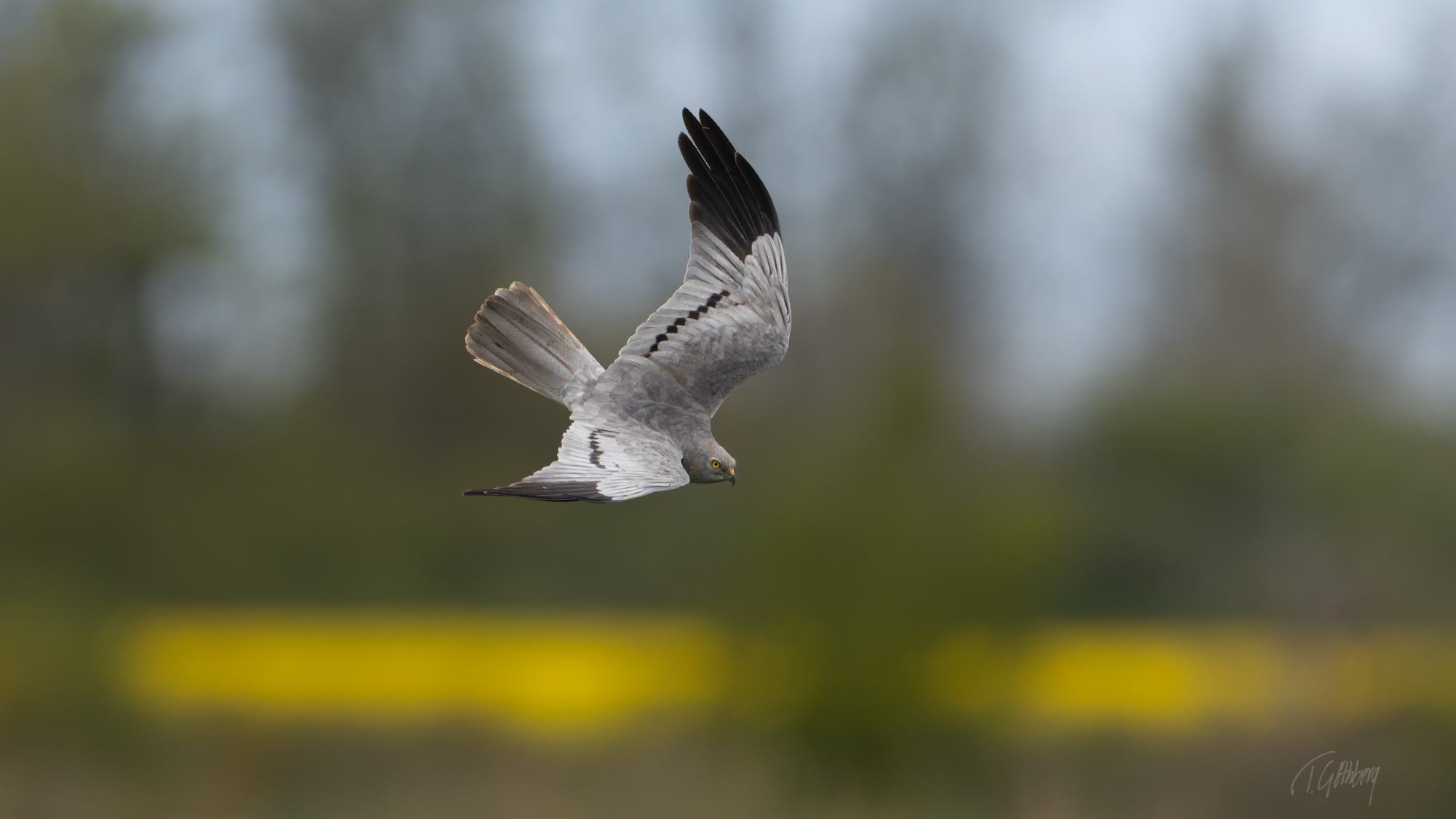 Med mjuka vingslag glider ängshöken fram över de öländska ängsmarkerna. Bakom den lyser rapsfälten i guld.