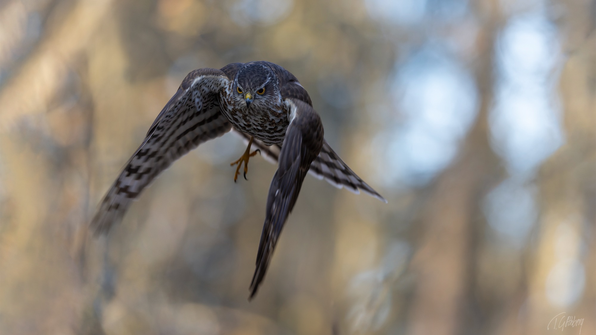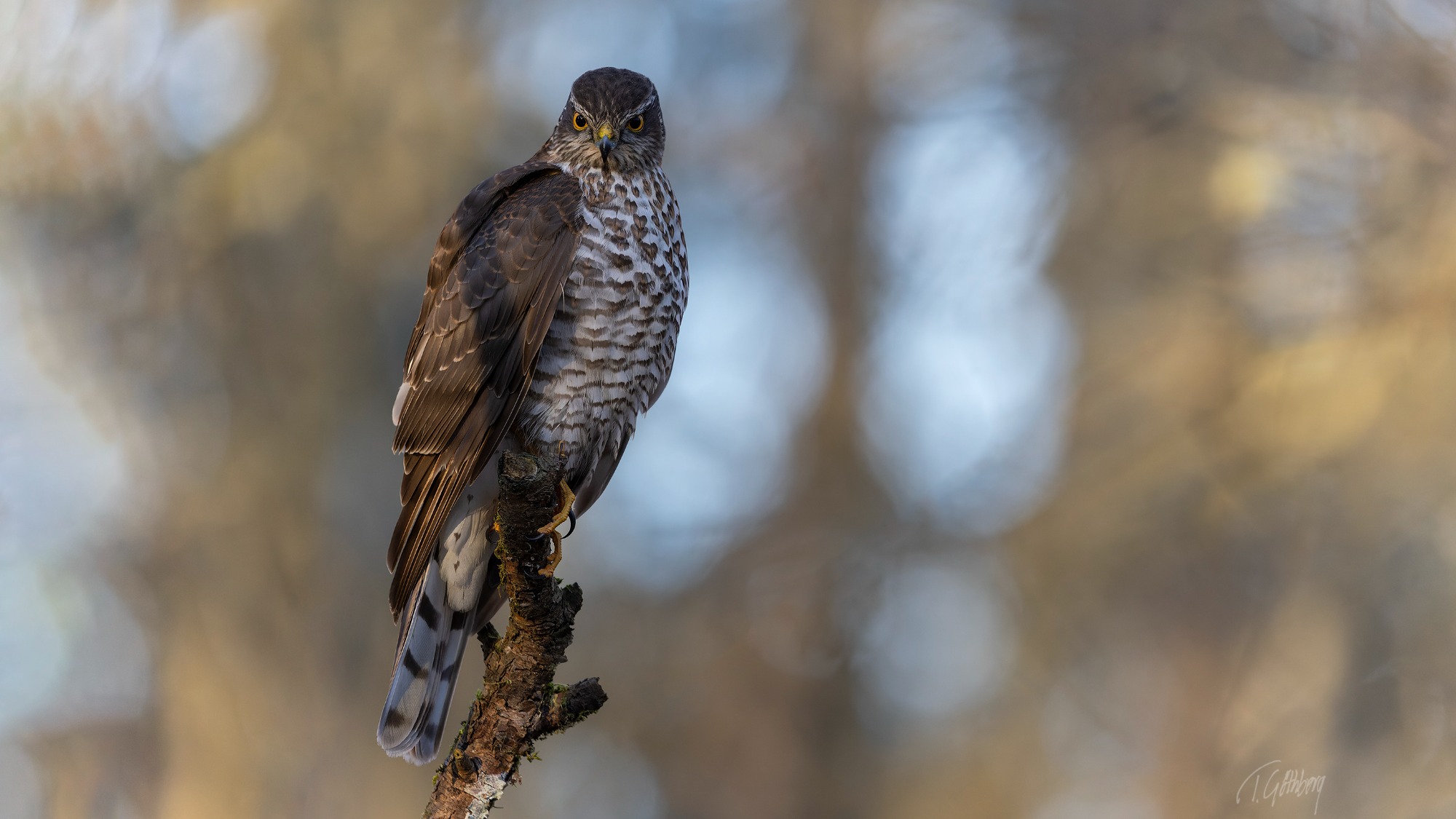 Sparvhöken sitter stilla och följer småfåglarna med blicken, beredd att i nästa ögonblick kasta sig över sitt byte.