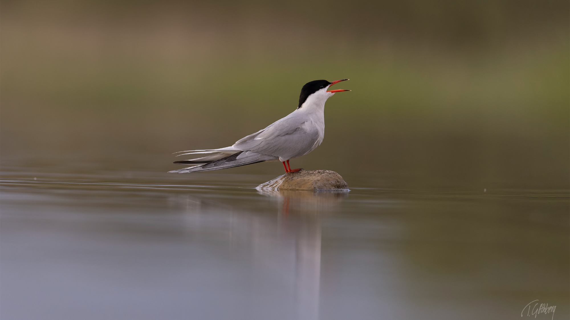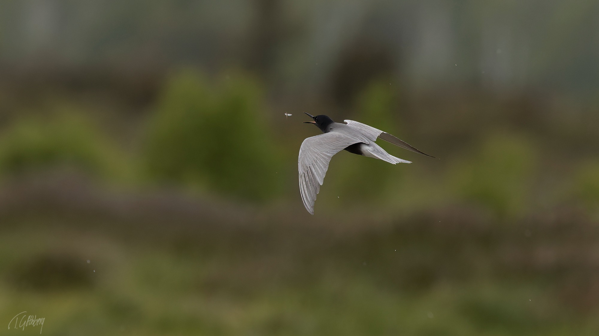 Svärttärnorna jagar ivrigt insekter över dammen. Med vidöppen näbb är fågeln bara ett ögonblick från att sluka en slända.