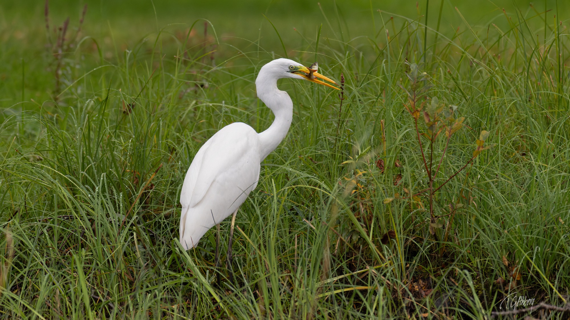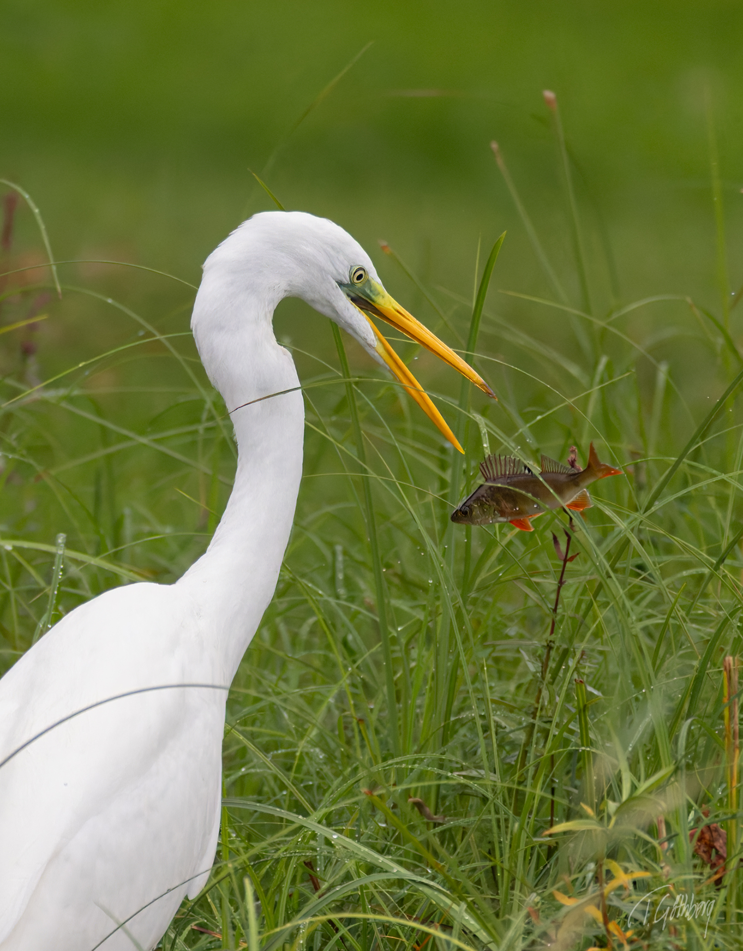 Ägretthägern har länge stått vid strandkanten. Till slut fångar den en liten abborre, som snabbt kastas upp i luften och sväljs hel.