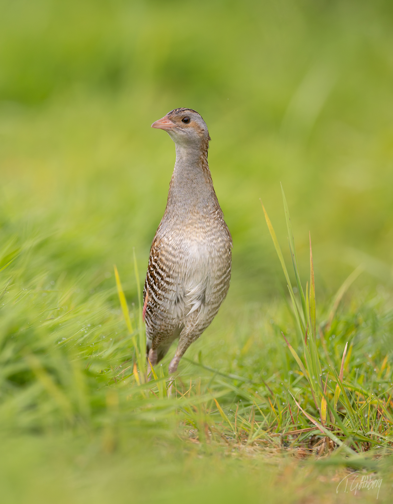 Under junikvällen hörs kornknarrens typiska raspande läte, krex-krex. Fågeln visar sig hastigt innan den åter gömmer sig i gräset.