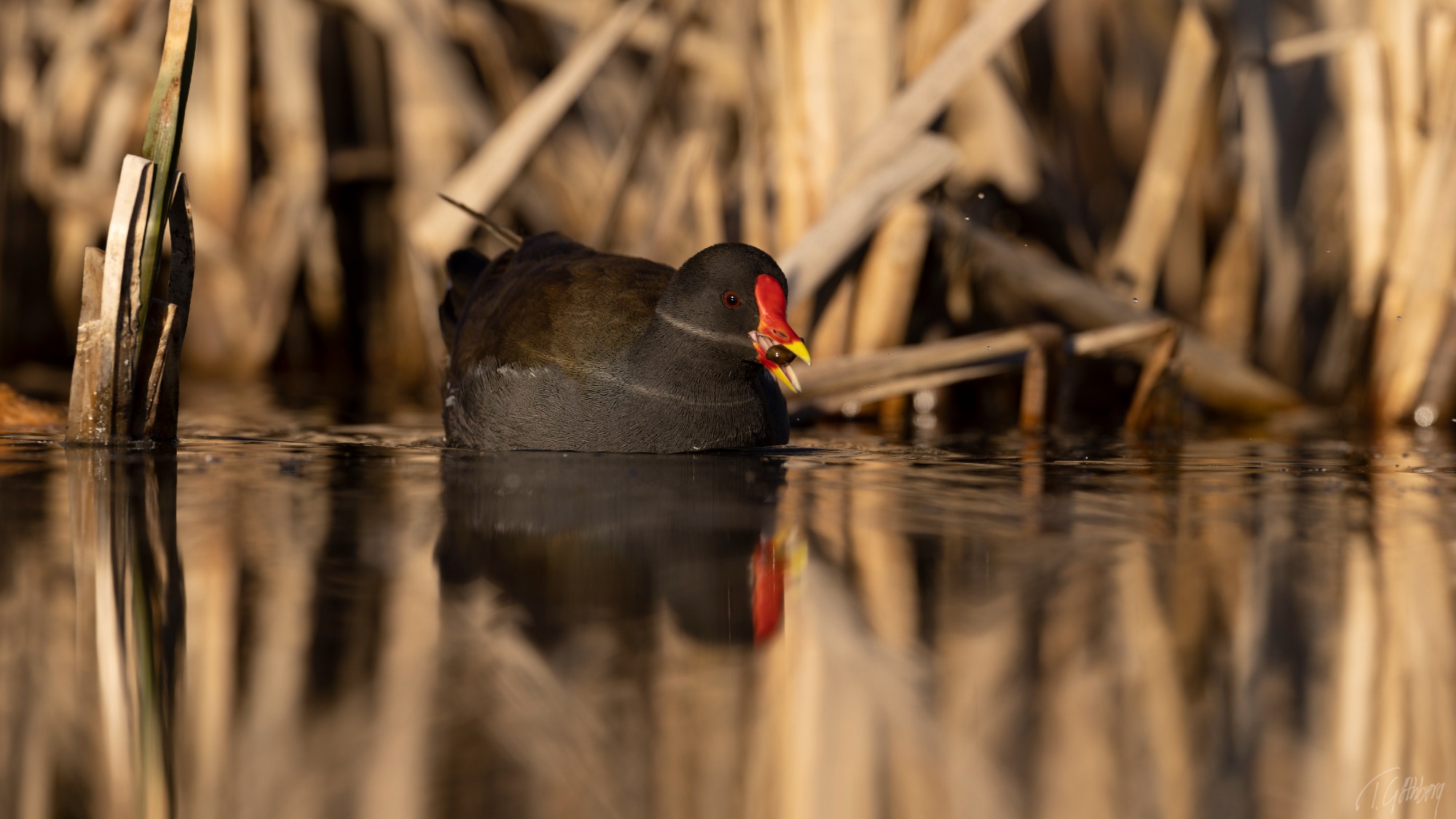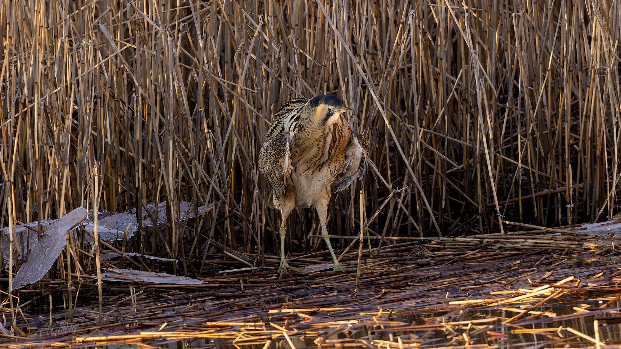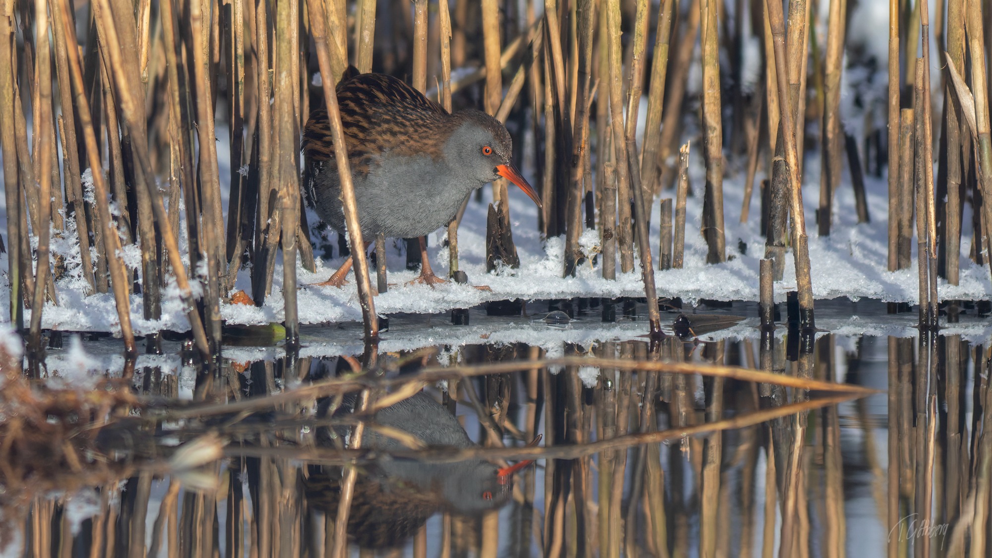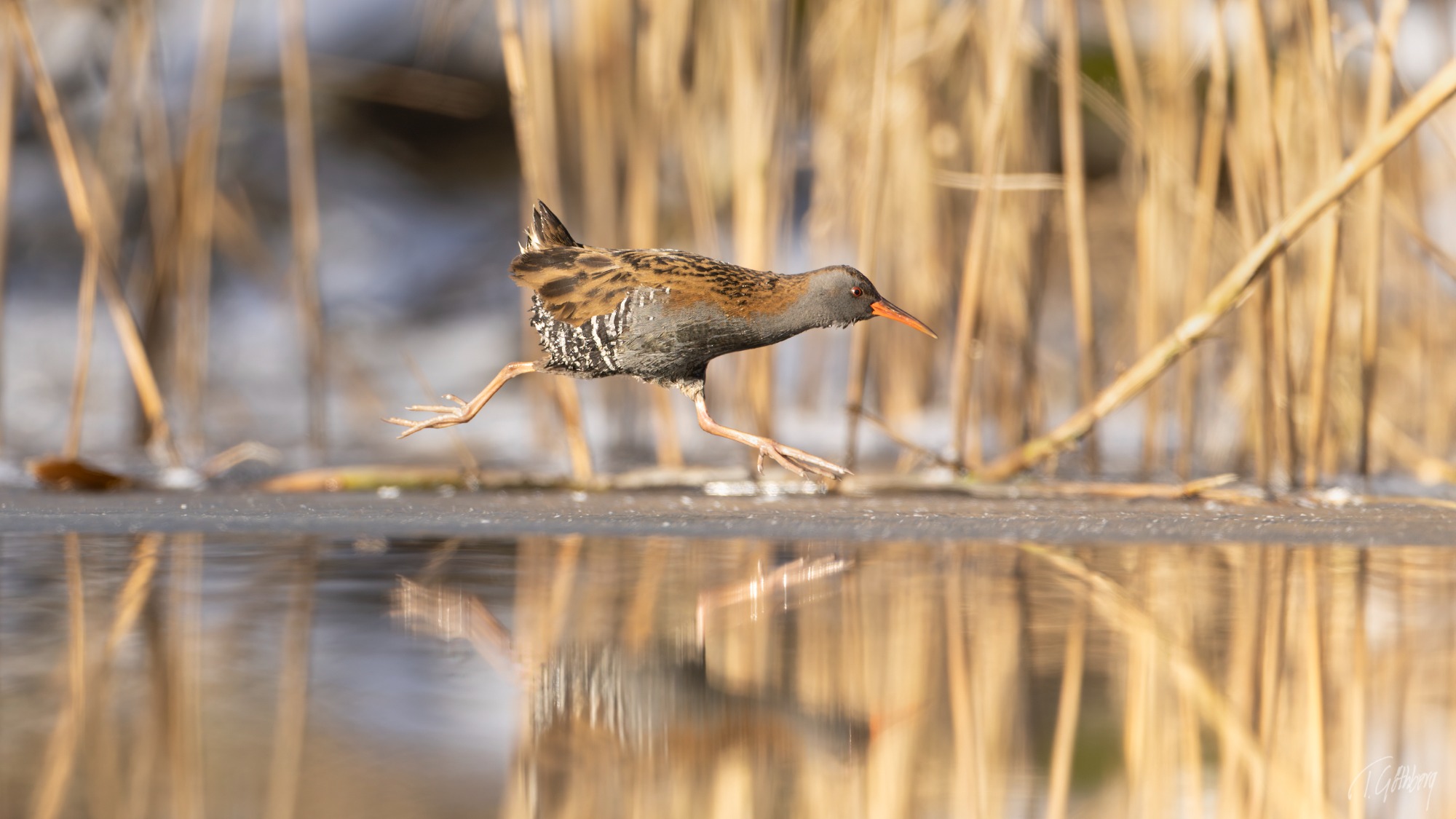Rallen har hamnat mellan två vassbälten och får bråttom tills den åter når vassens skydd. Så snabbt att båda fötterna är i luften samtidigt!
