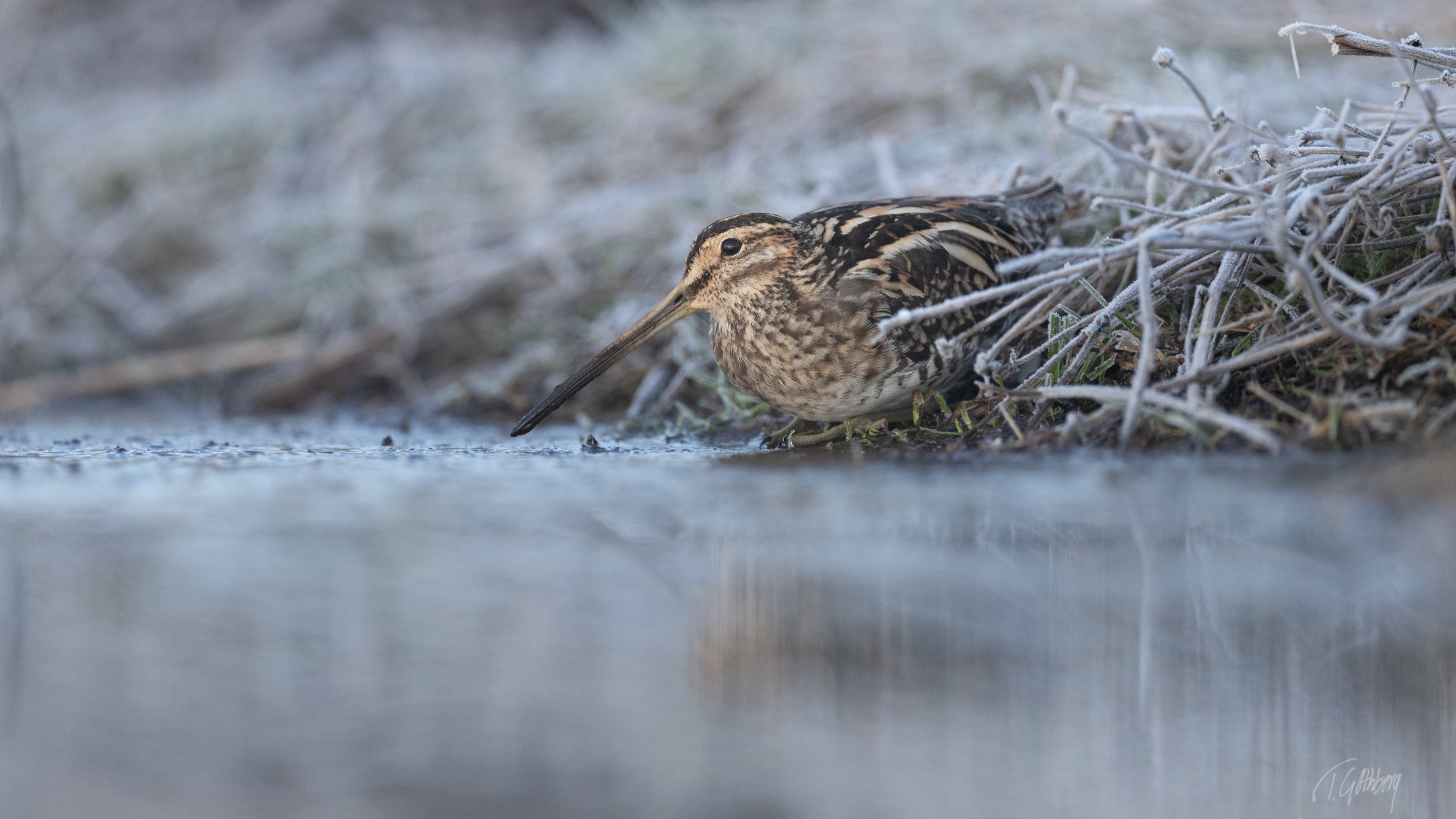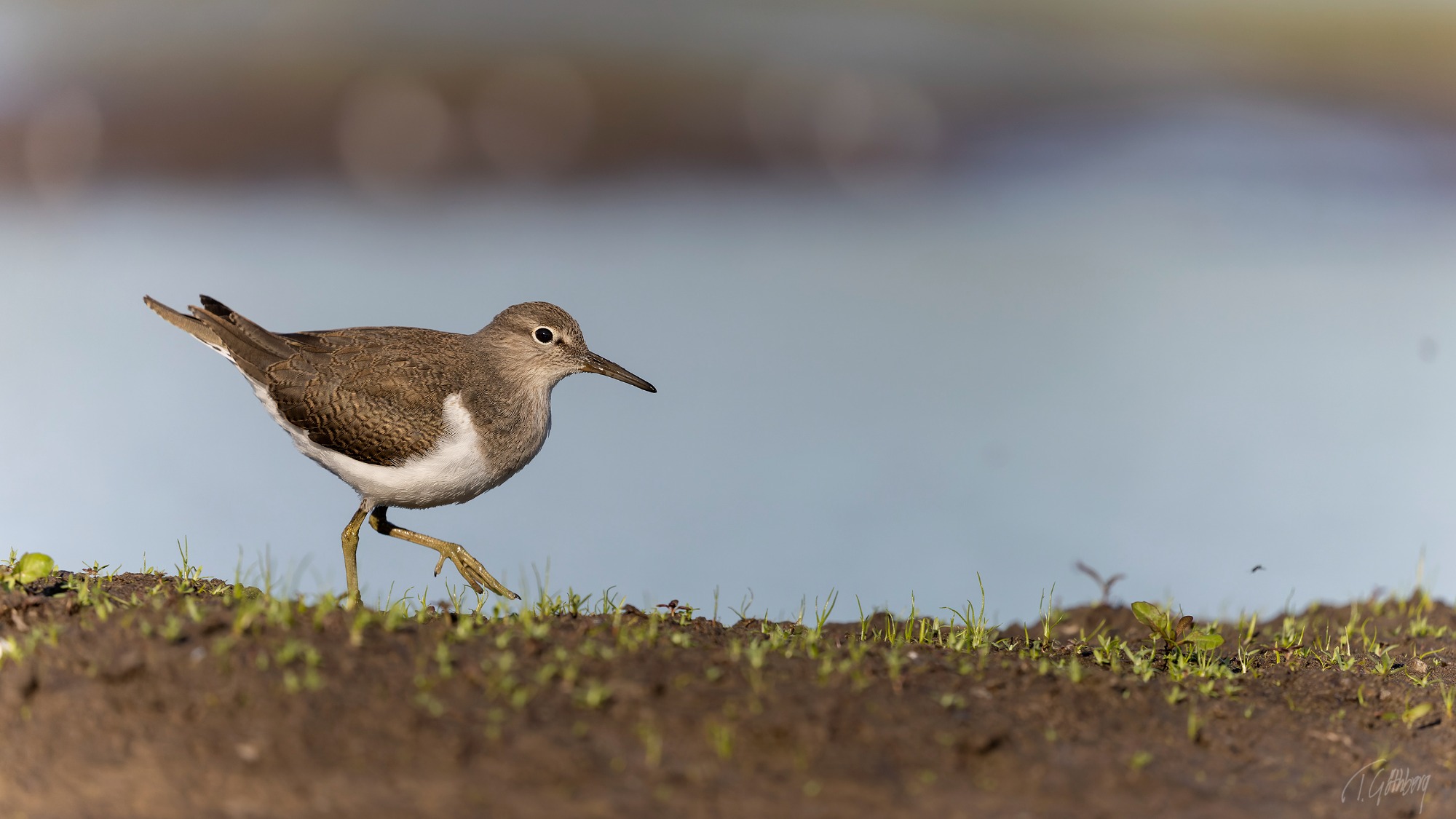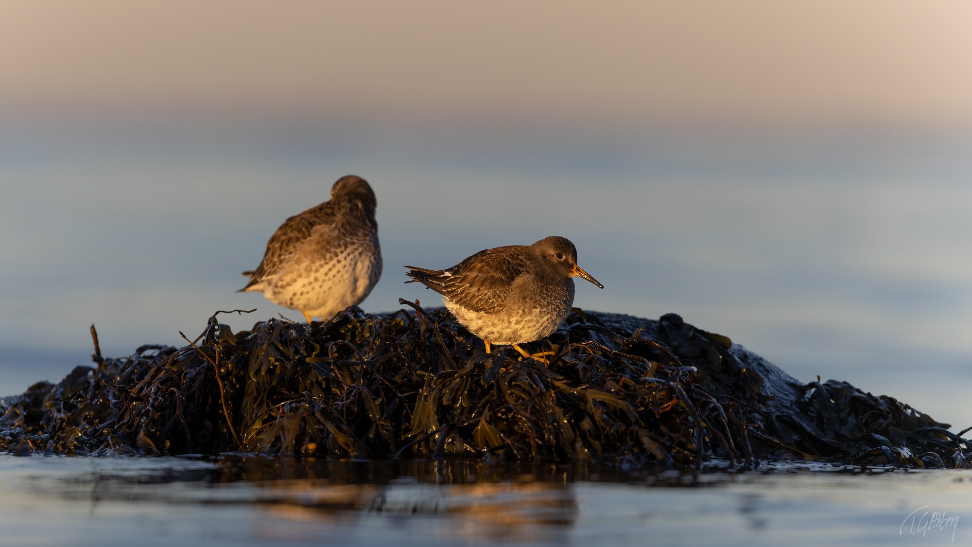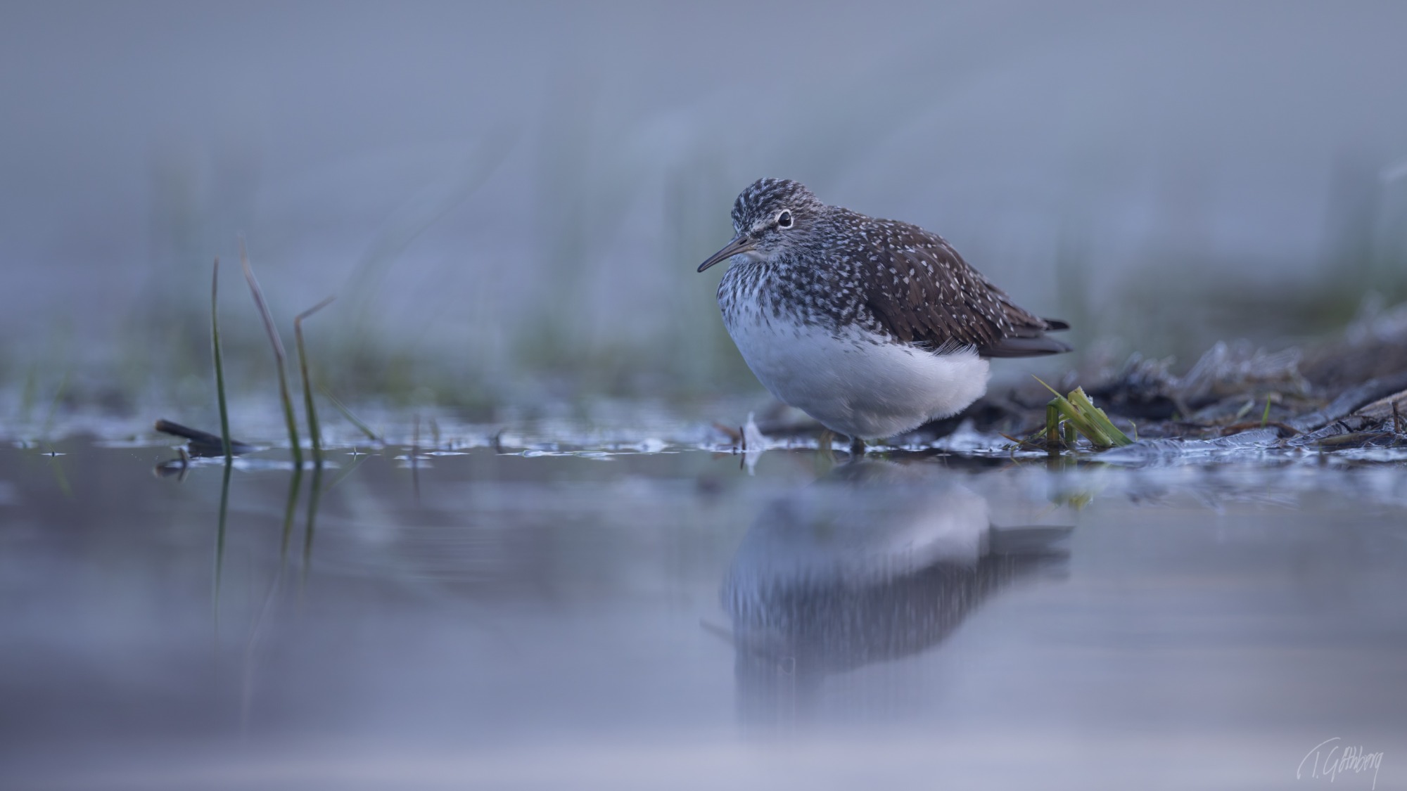 Under den blå timmen, innan solens strålar färgar vattnet, vilar skogssnäppan tyst vid strandkanten.