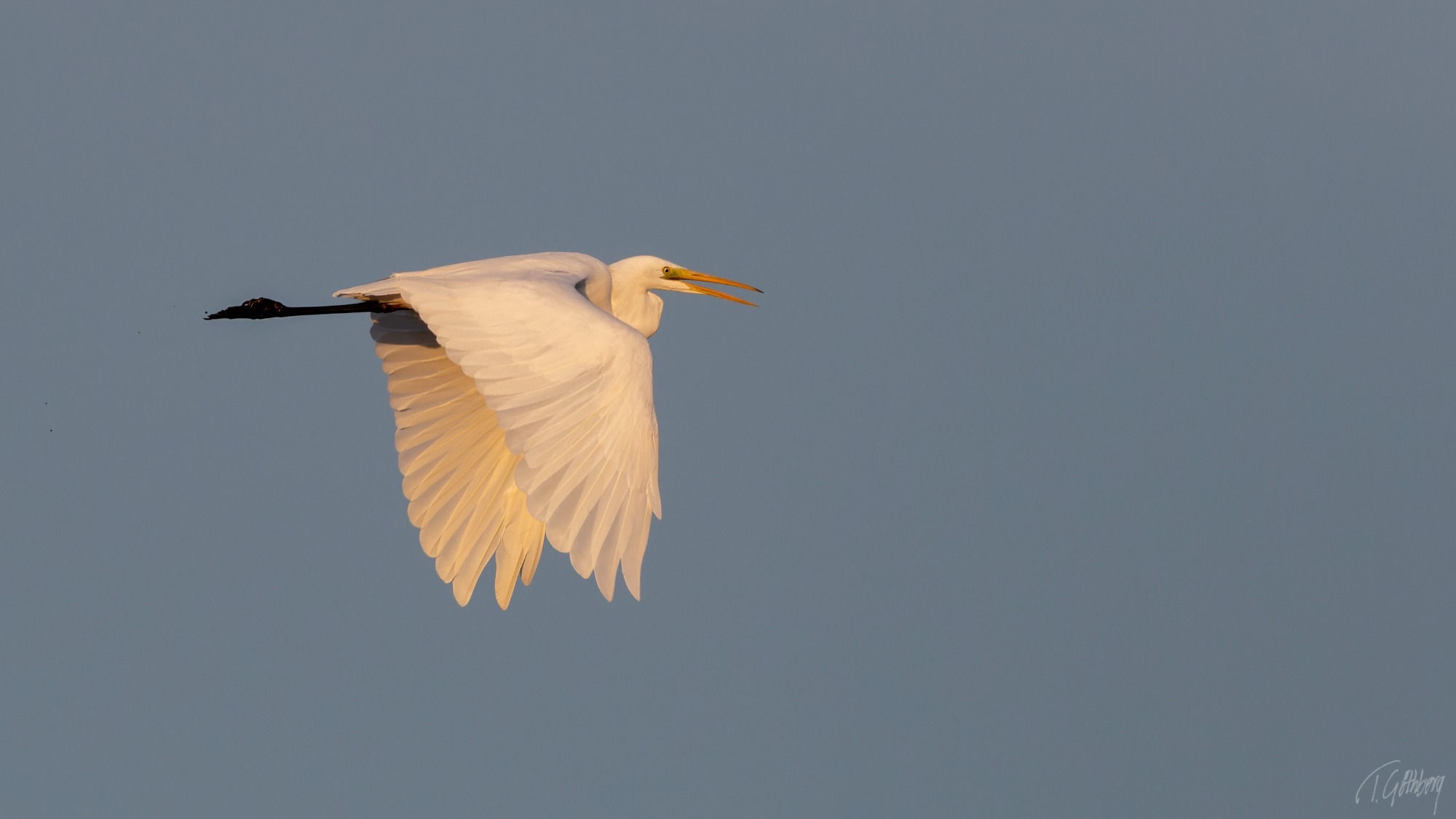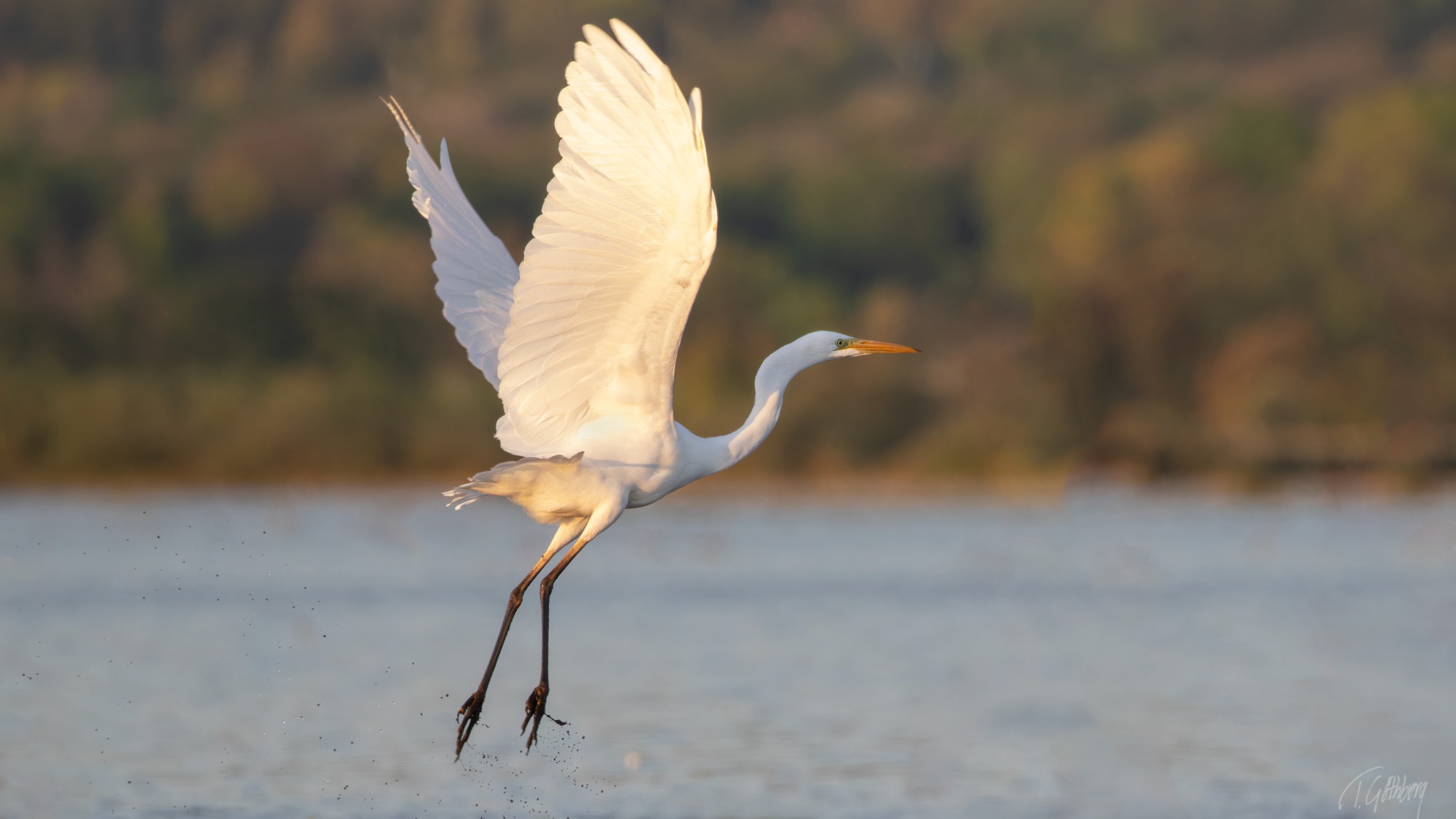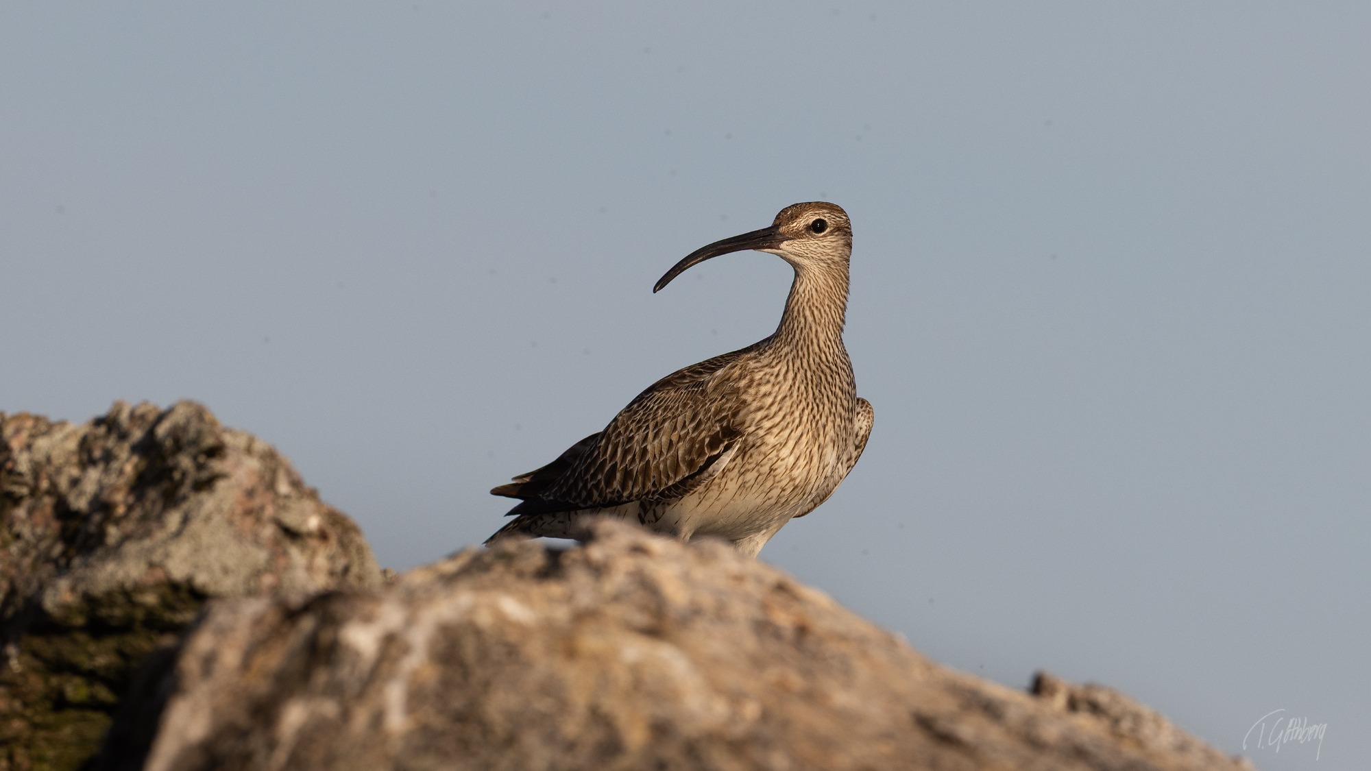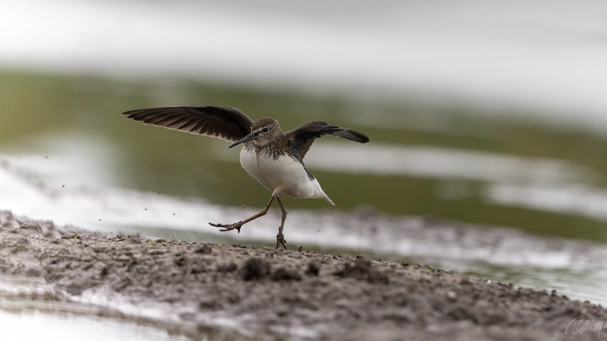 Storspoven har just landat, men blicken avslöjar en vaksamhet mot fotografen. I luften dansar småkryp som också fastnat på bilden.