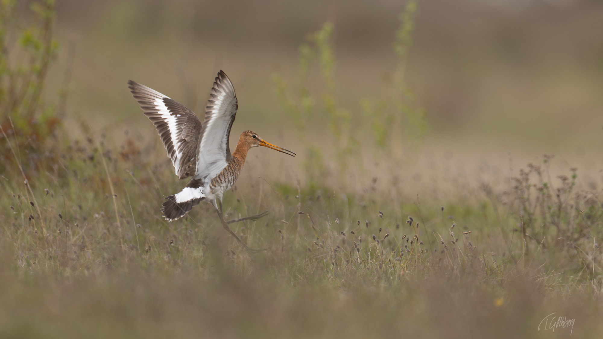 Det ser nästan ut som att snäppan sparkar mot flygfäna för att freda sig, men i själva verket har den just landat.