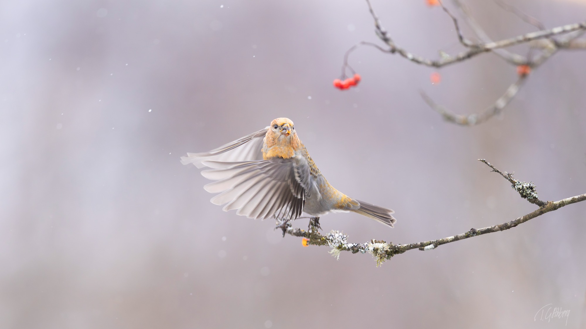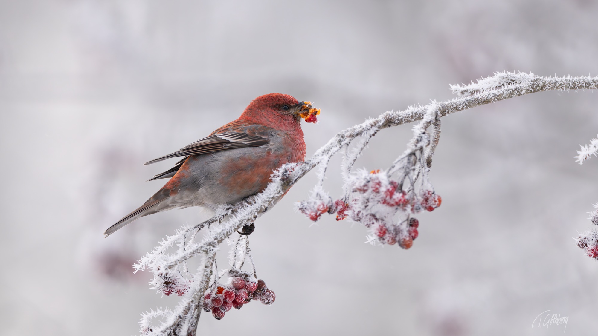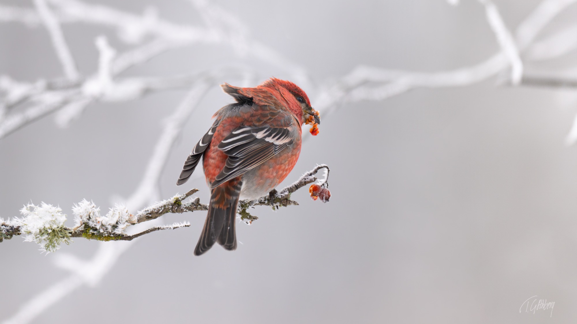 I det rimfrostklädda landskapet har tallbitshanen funnit sitt mål – ett rönnbärsträd fyllt av hans älskade frön.