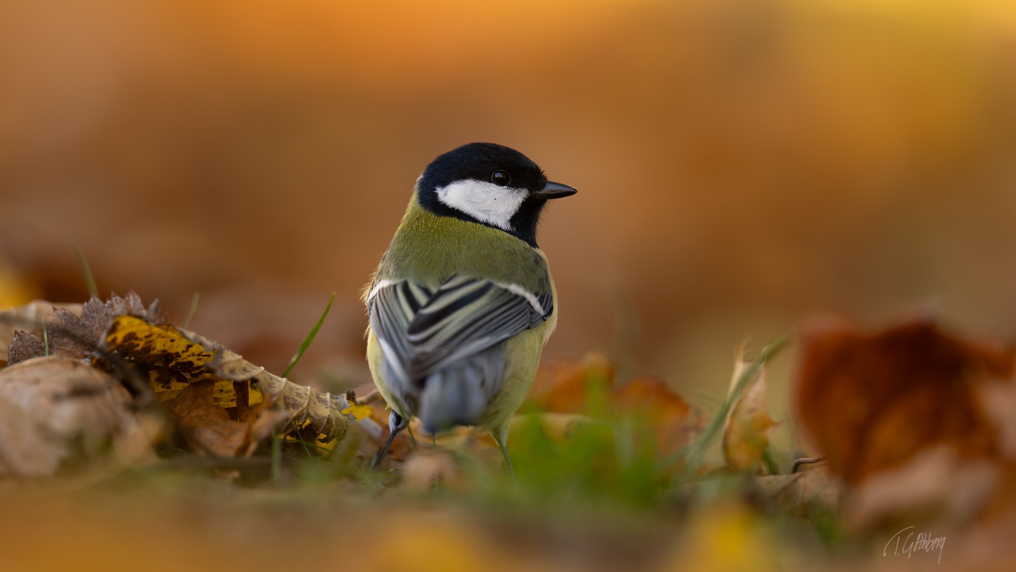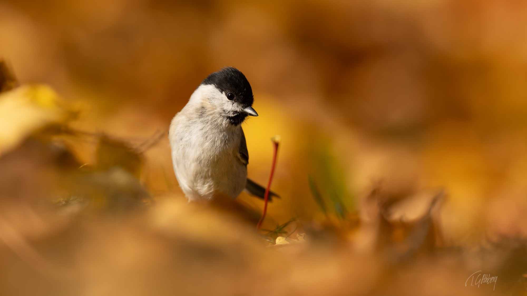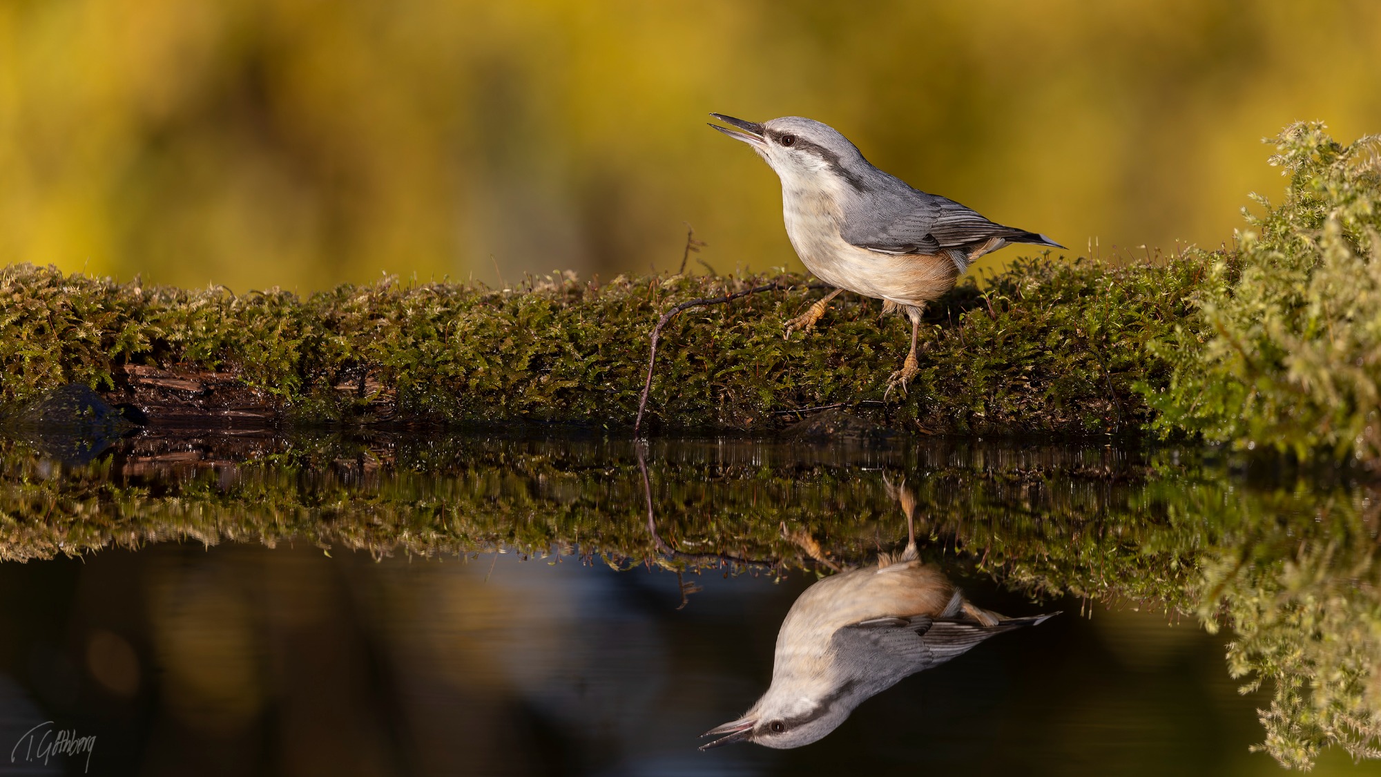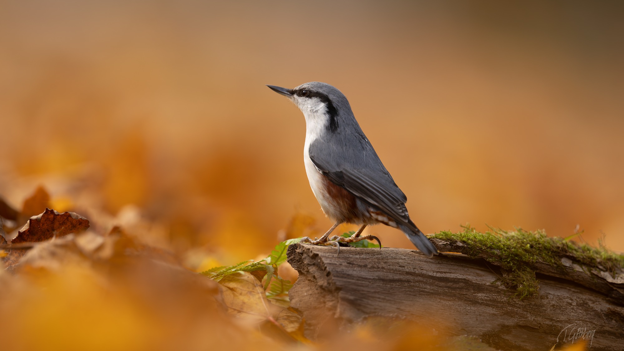 På sin utsiktspost bland höstlövens glöd spanar nötväckan – den lilla akrobaten som utan bekymmer klättrar nedför stammen med huvudet först.