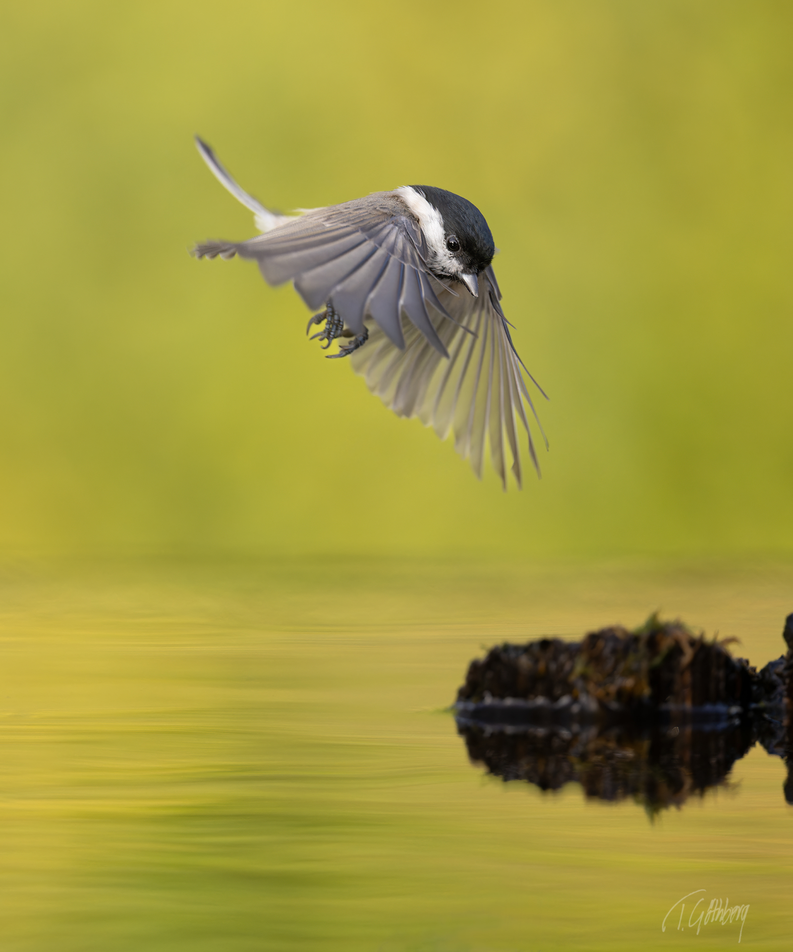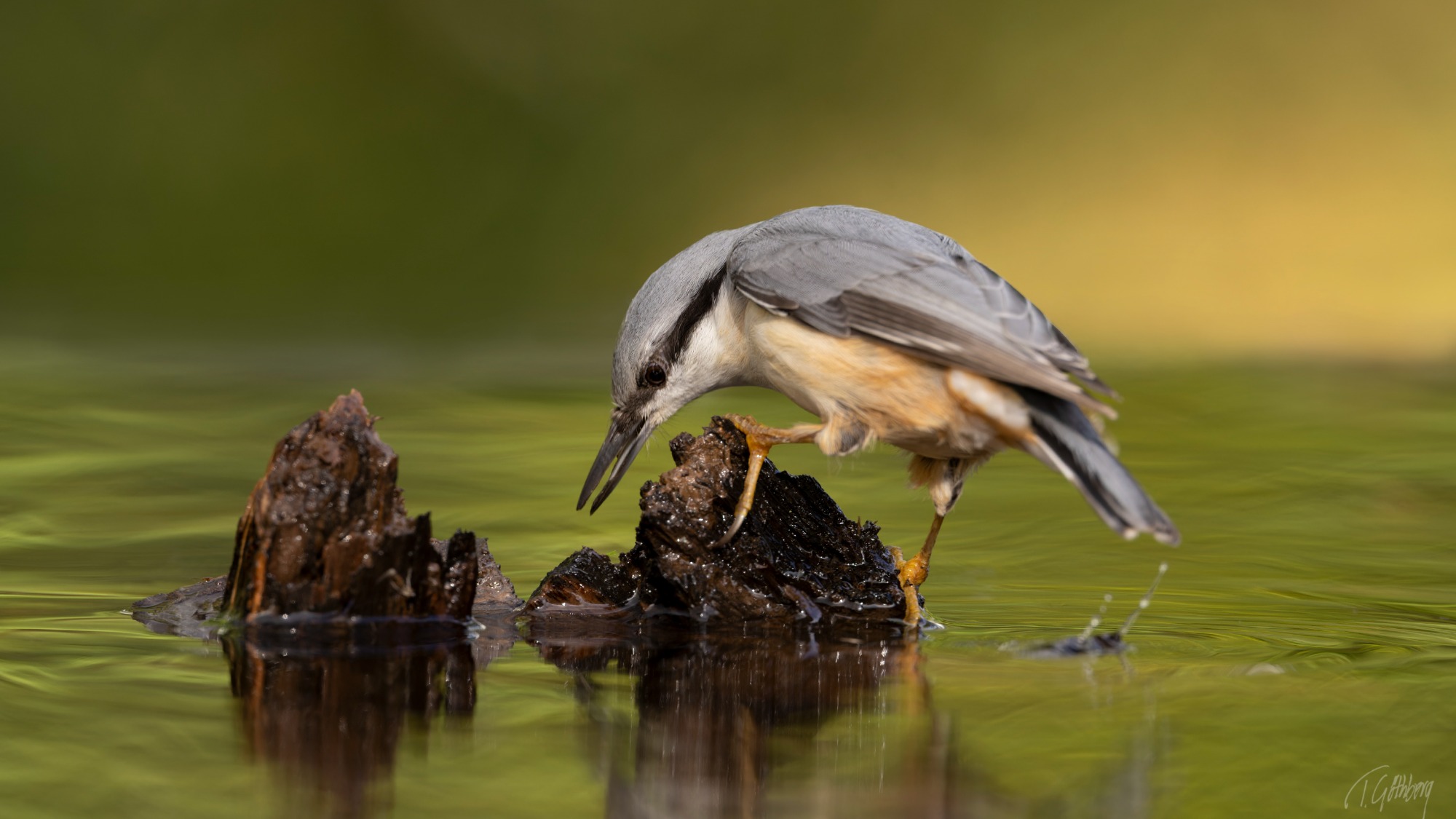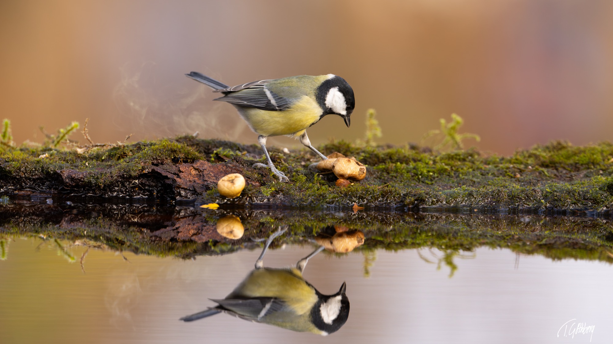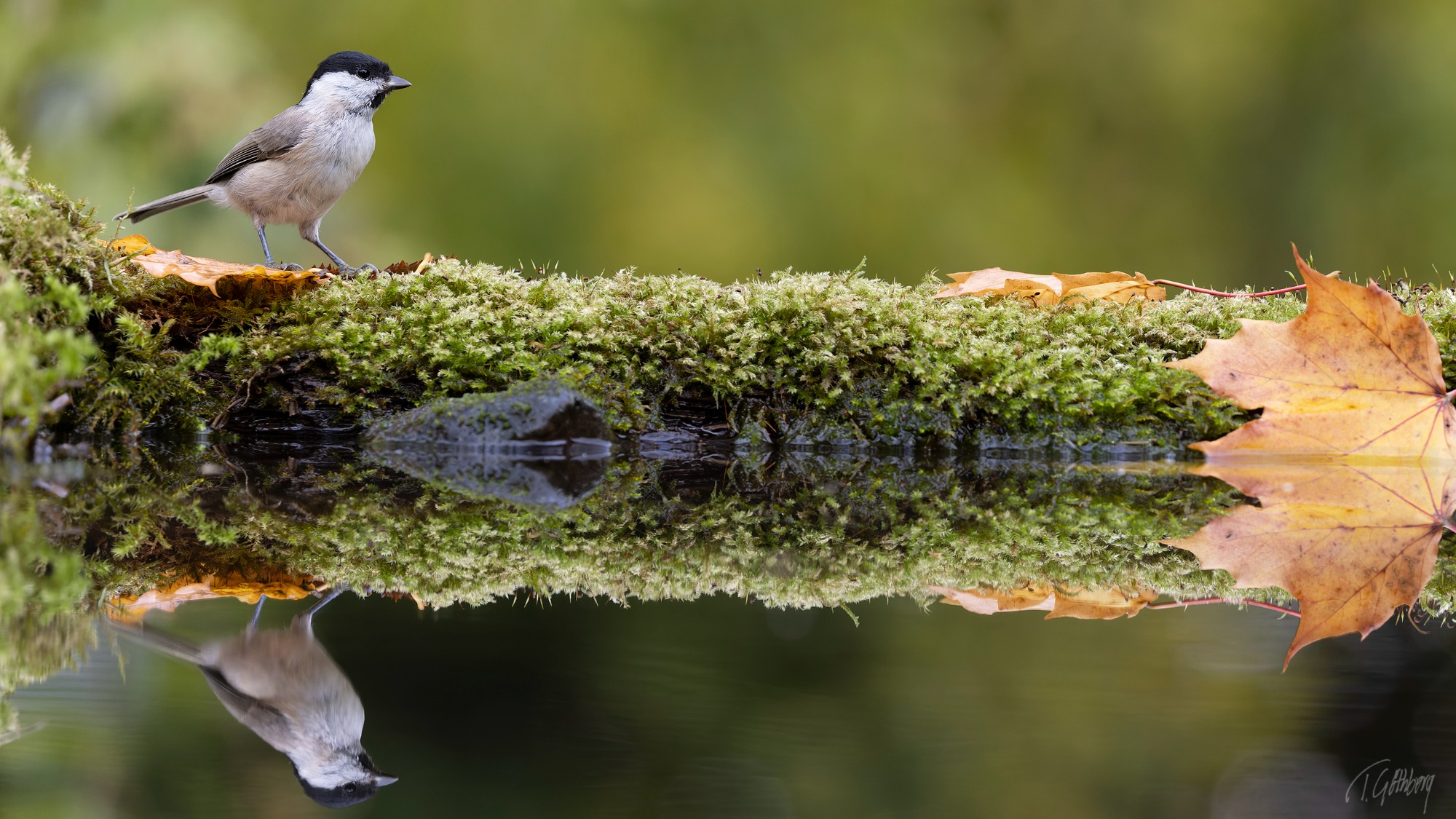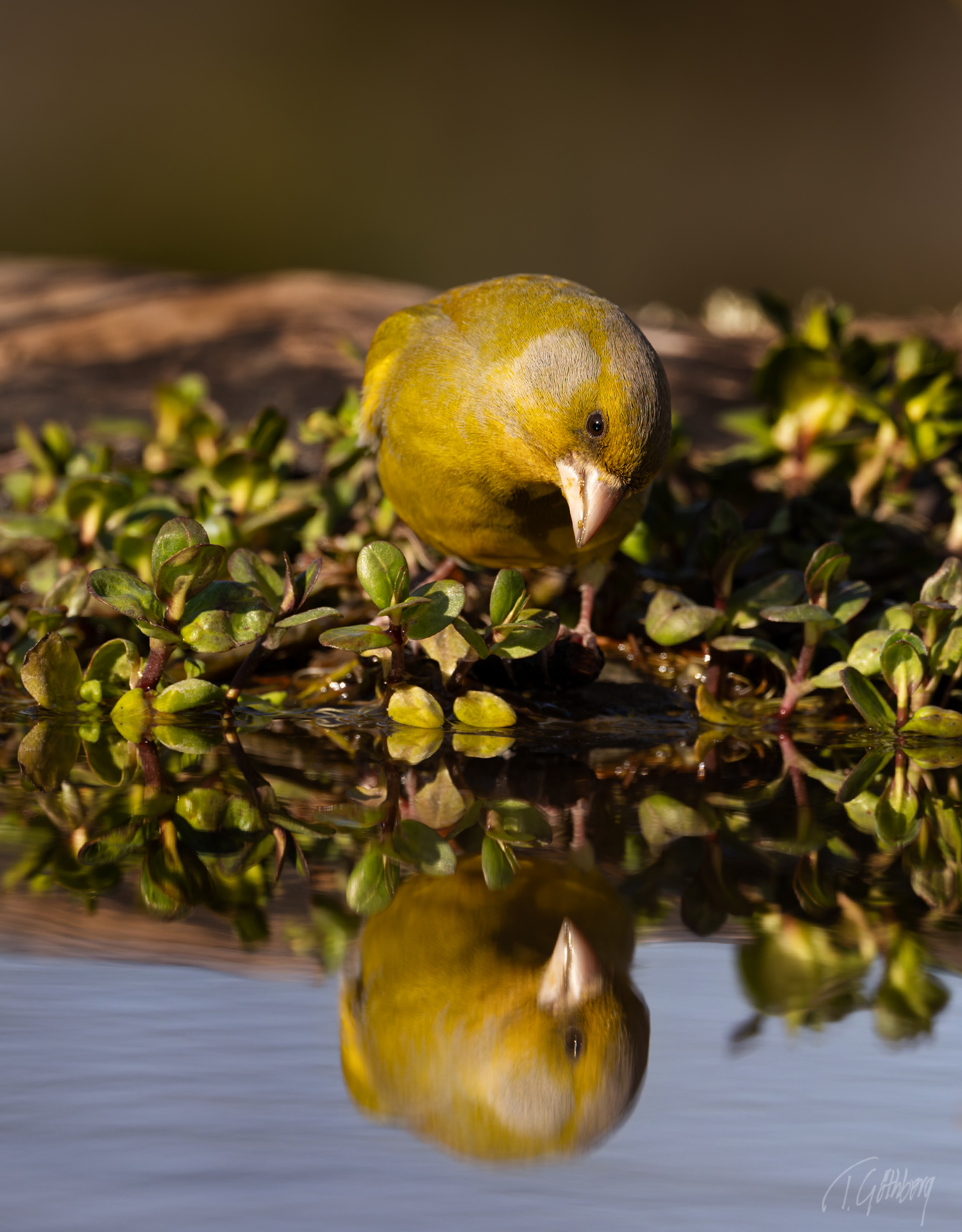 Grönfinken böjer sig ner för att dricka, men tycks plötsligt få syn på sin spegelbild, vrider på huvudet och stannar upp i eftertanke.
