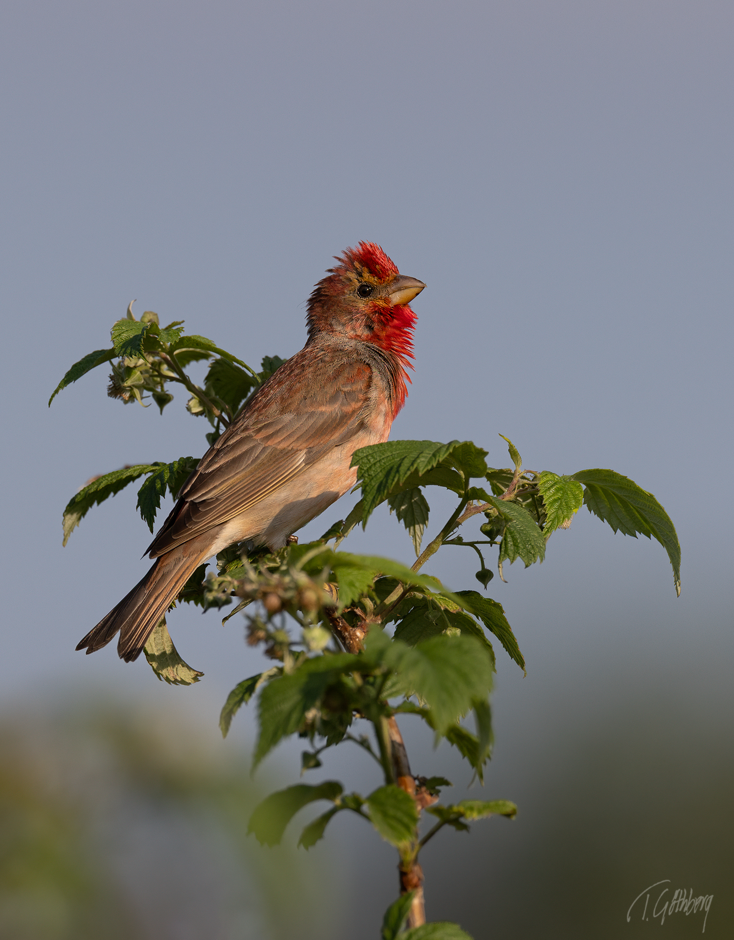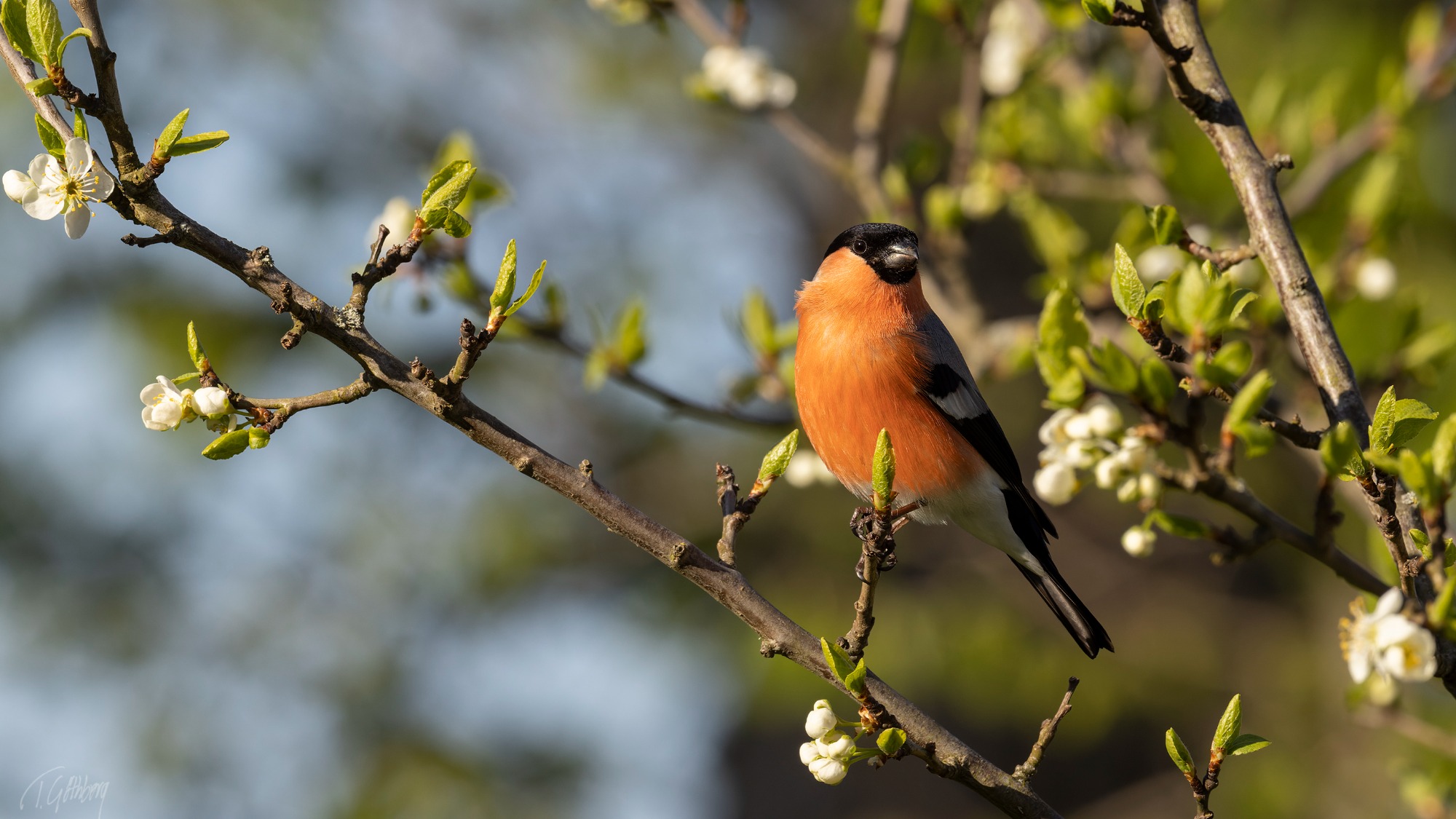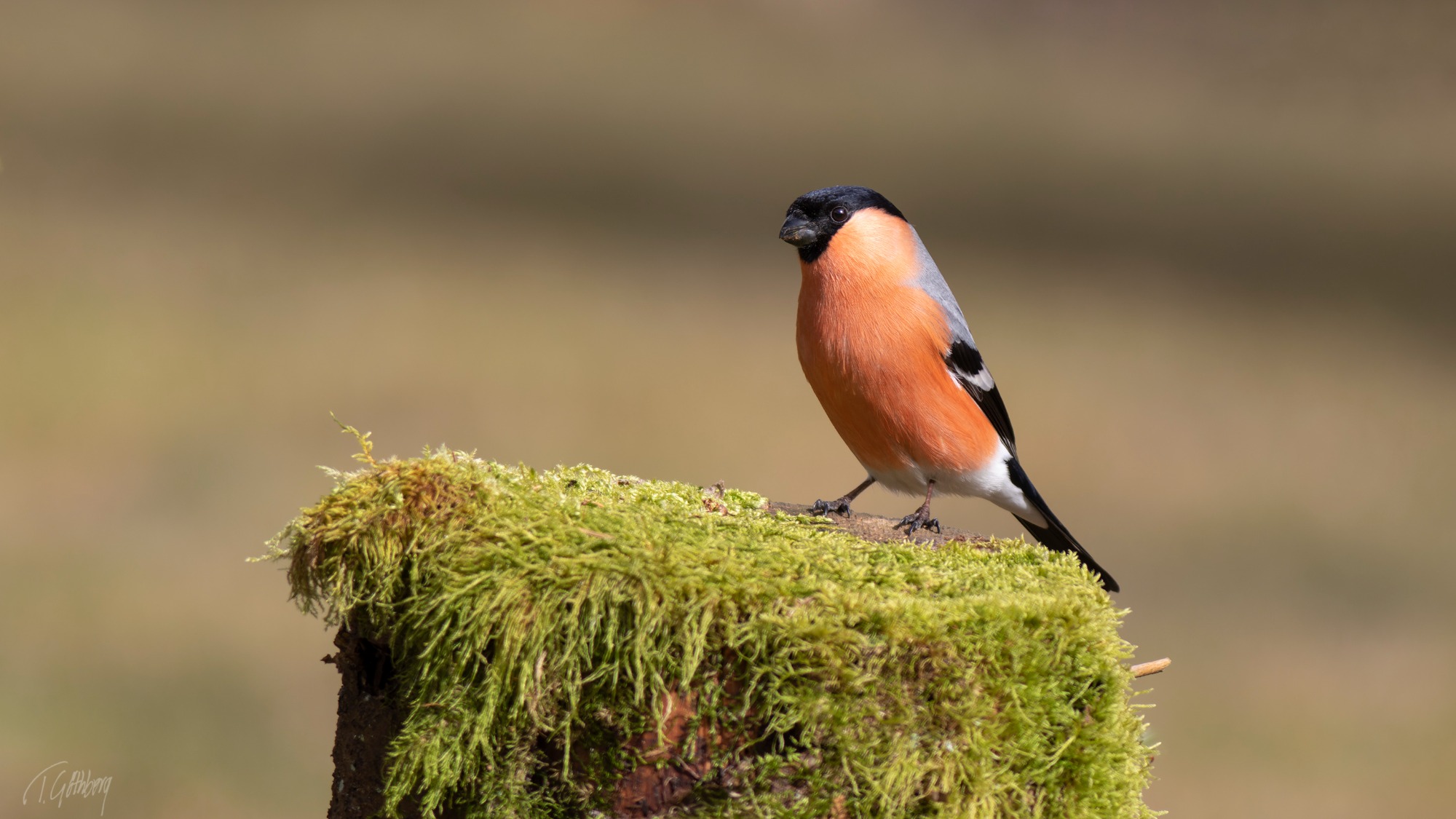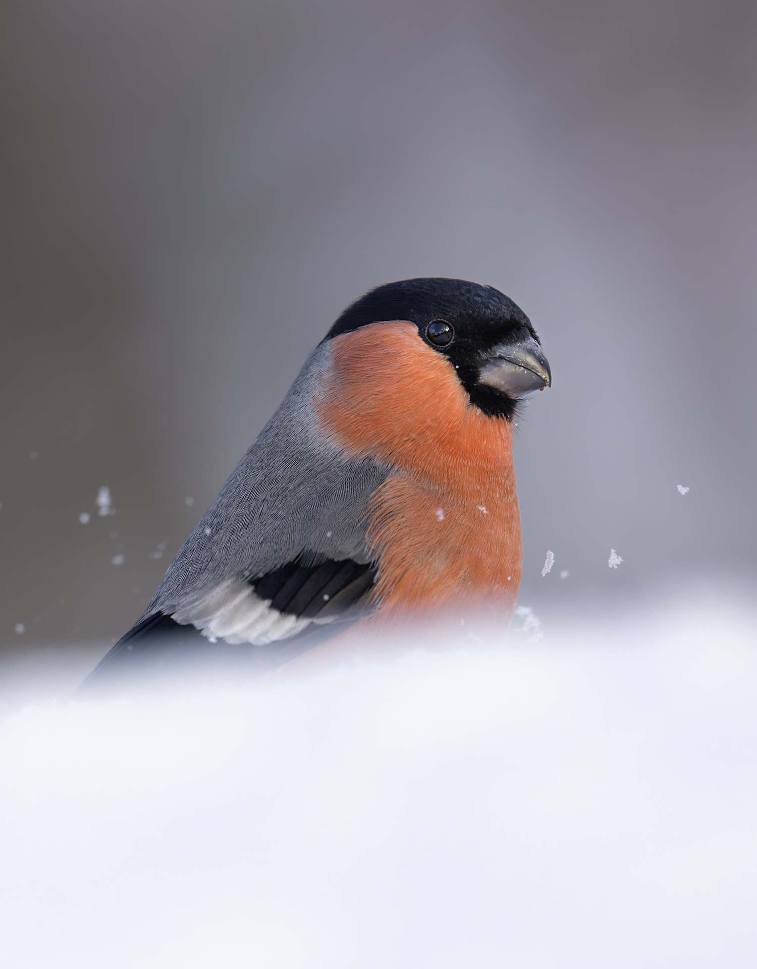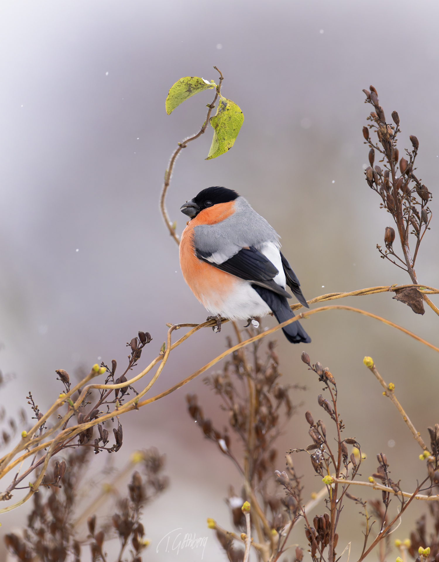 Hösten har nästan suddat ut färgerna. Bara två gröna löv trotsar tiden och domherrens röda bröst lyser upp scenen.