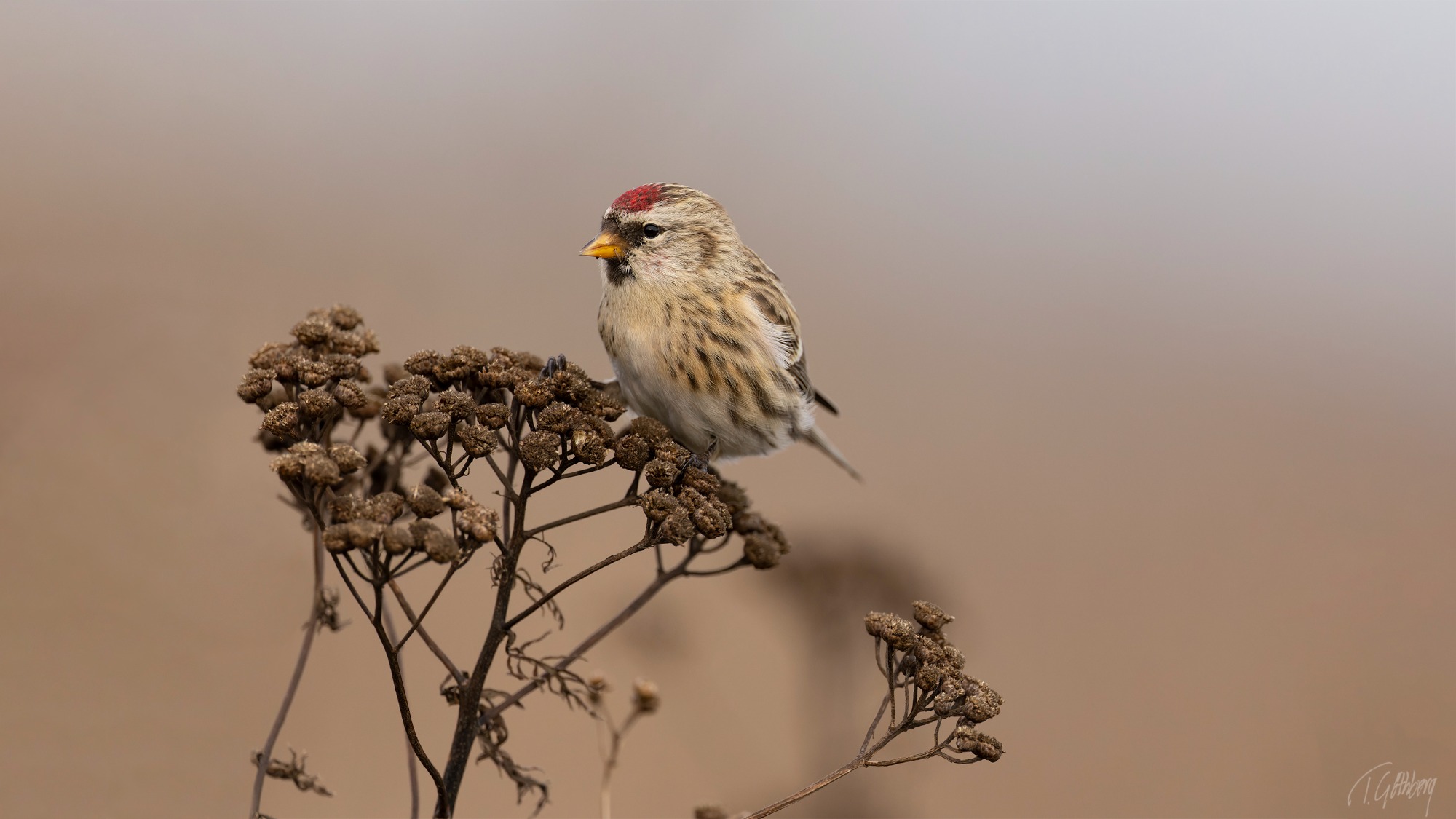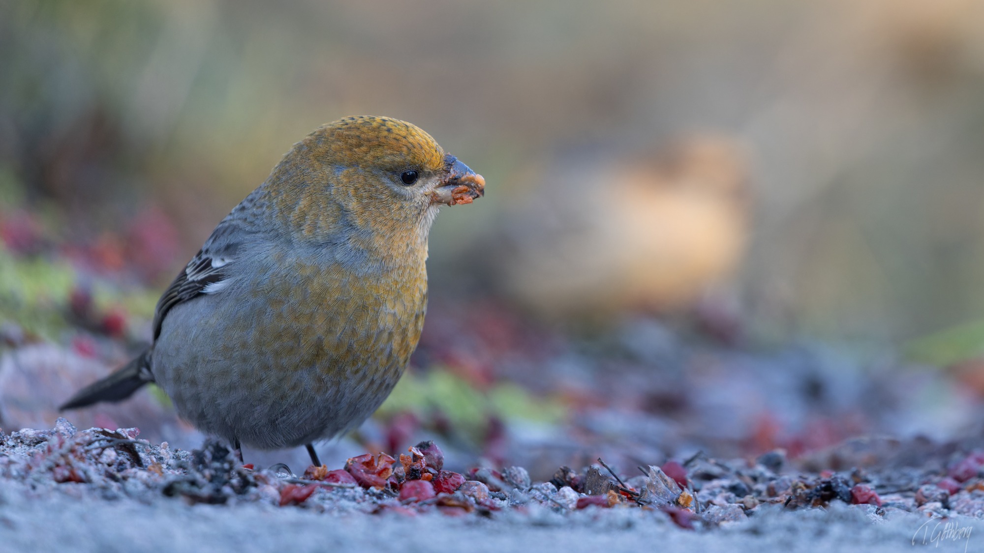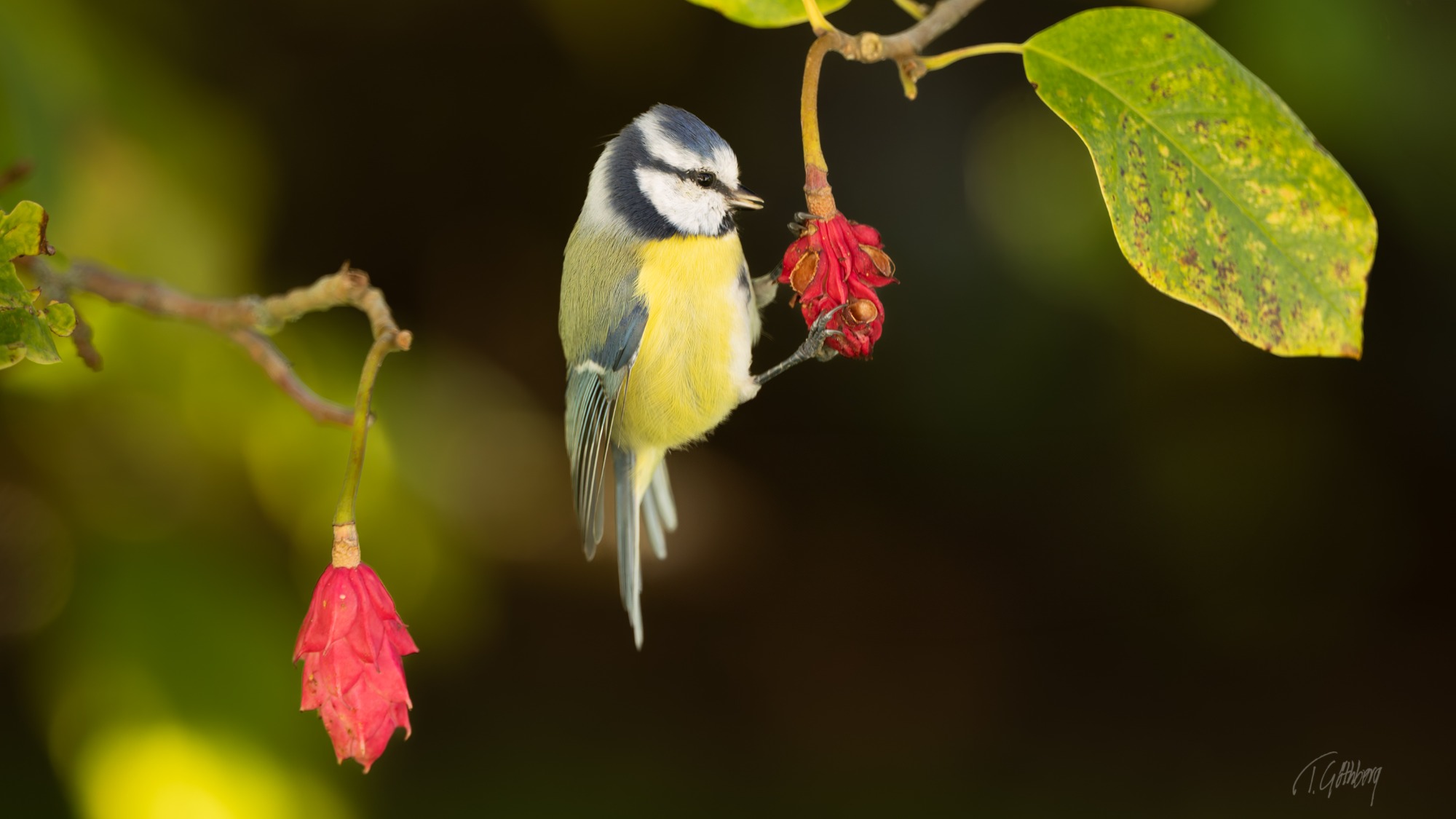 Tallbit, kallas också för dumsnut eftersom den är så orädd för människor. Vackert belyst sitter hon och mumsar frön av rönnbär.
