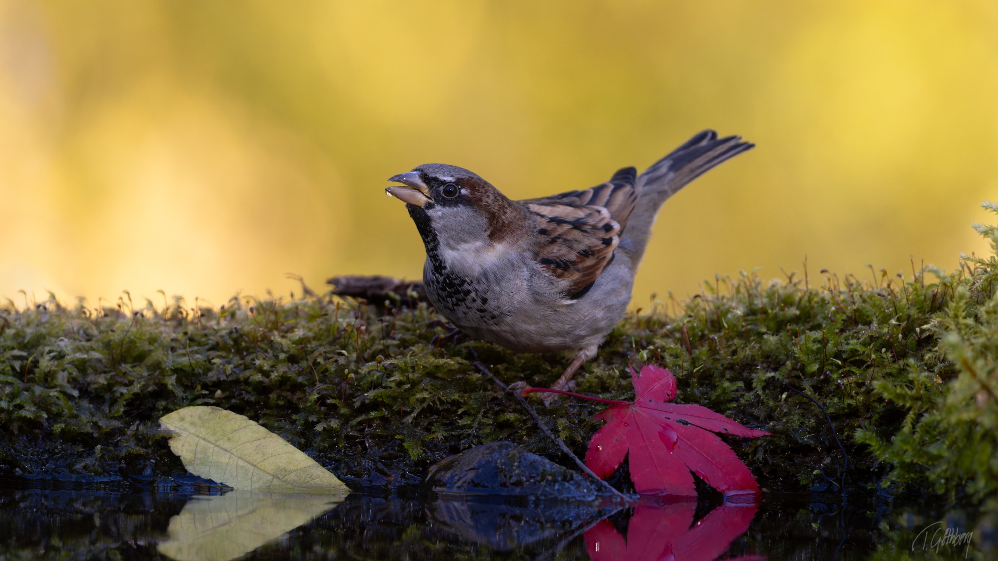 Visst är även en färgfattig gråsparv vacker? Den lilla droppen under näbben visar att han just druckit.