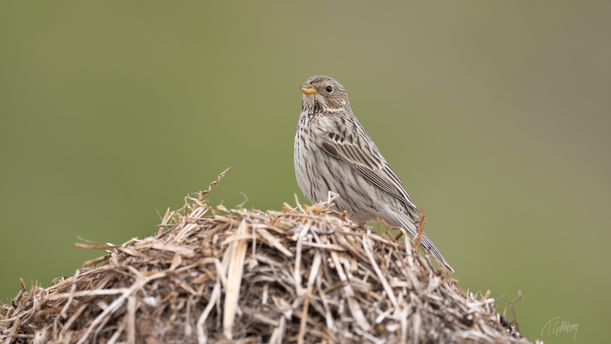 Kornsparven - den största fågeln i familjen fältsparvar, har tagit plats högst upp på en väderbiten ensilagehög.