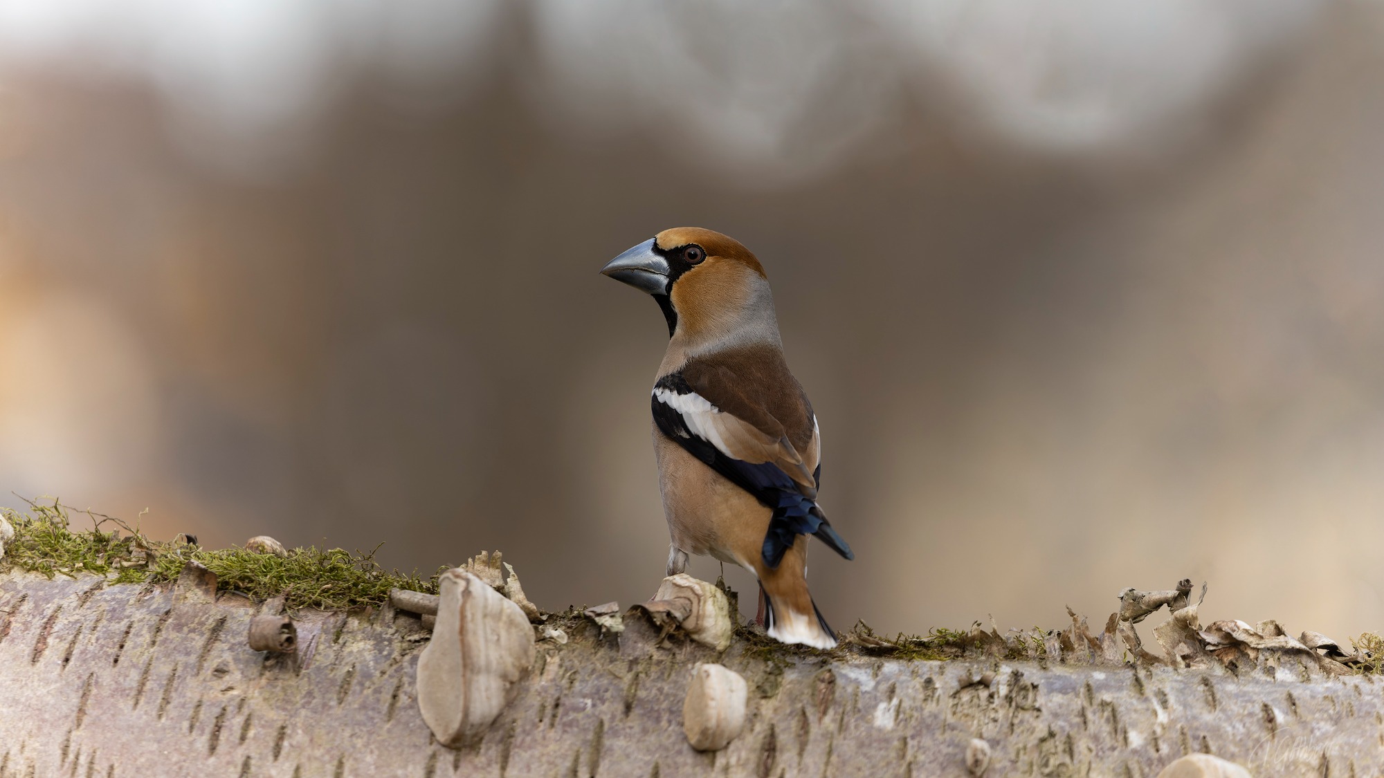 En stenknäck slår sig ner på en björkstam täckt av svamp och mossa. Det är vår och dess näbbfärg har blivit vackert blåsvart.